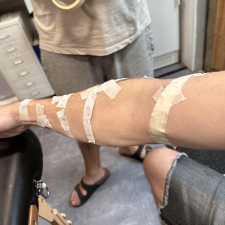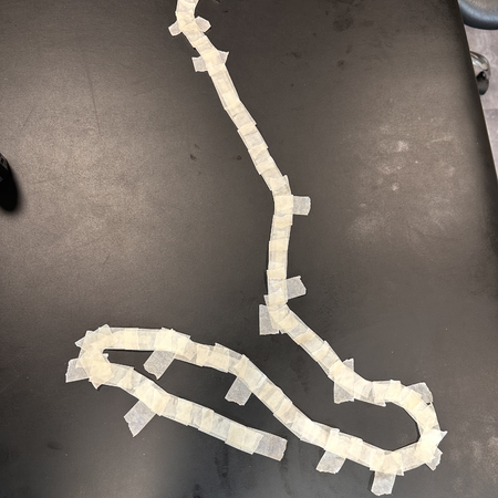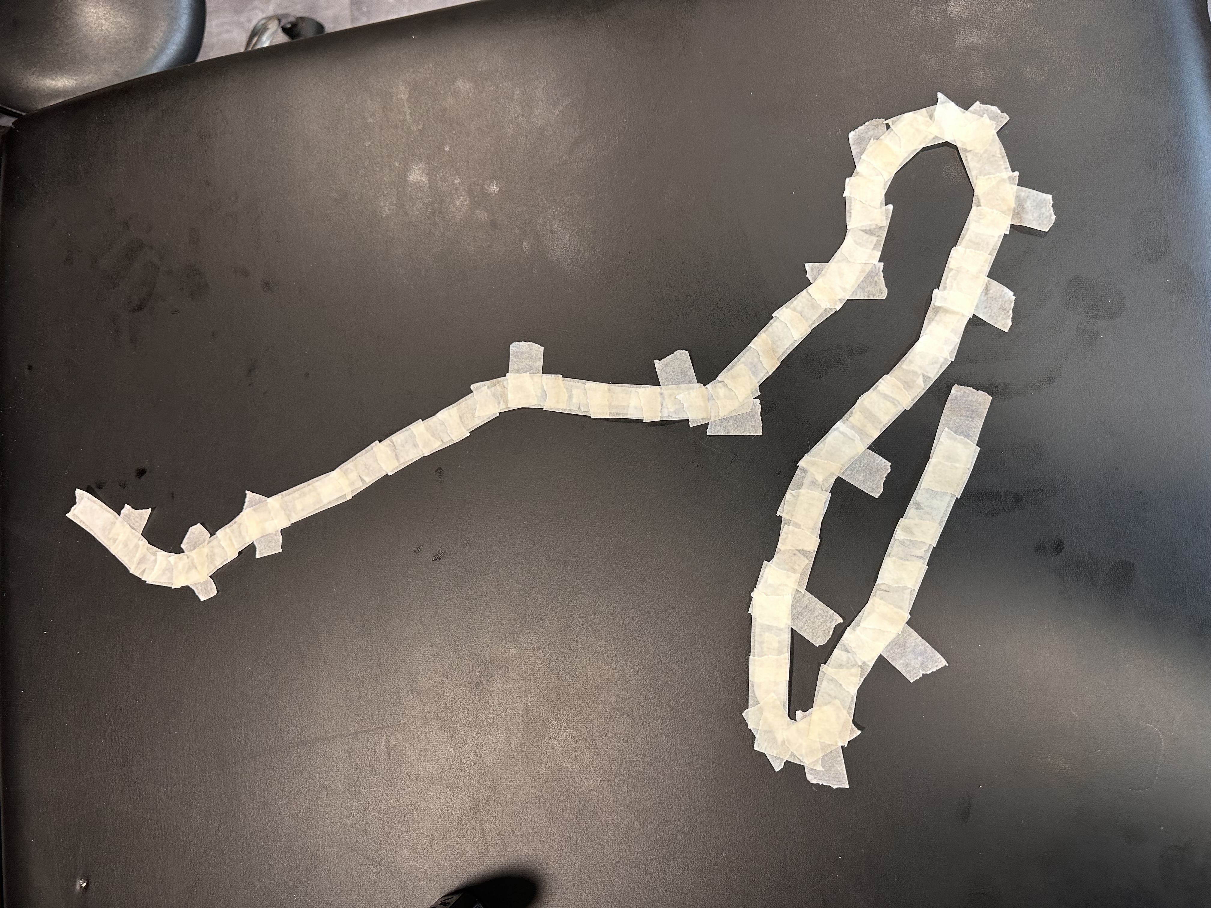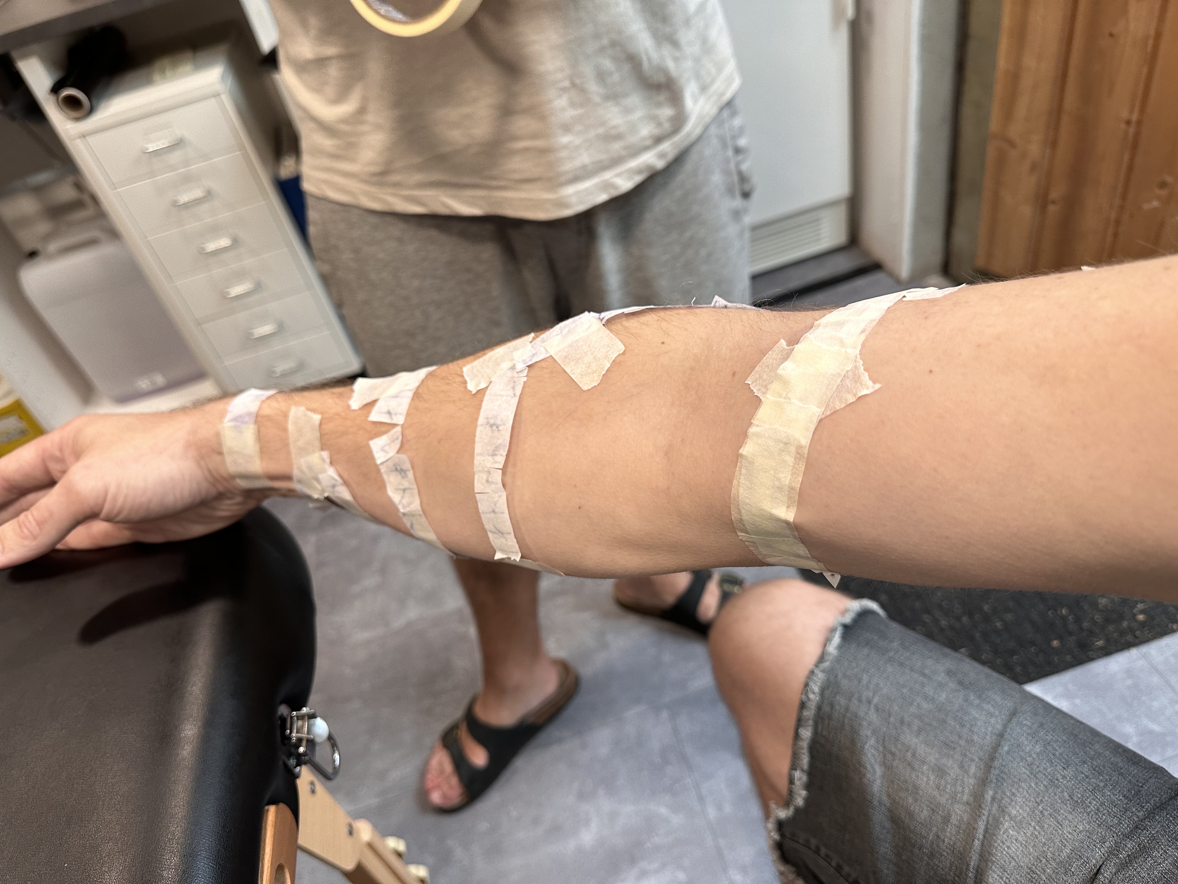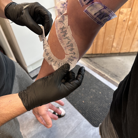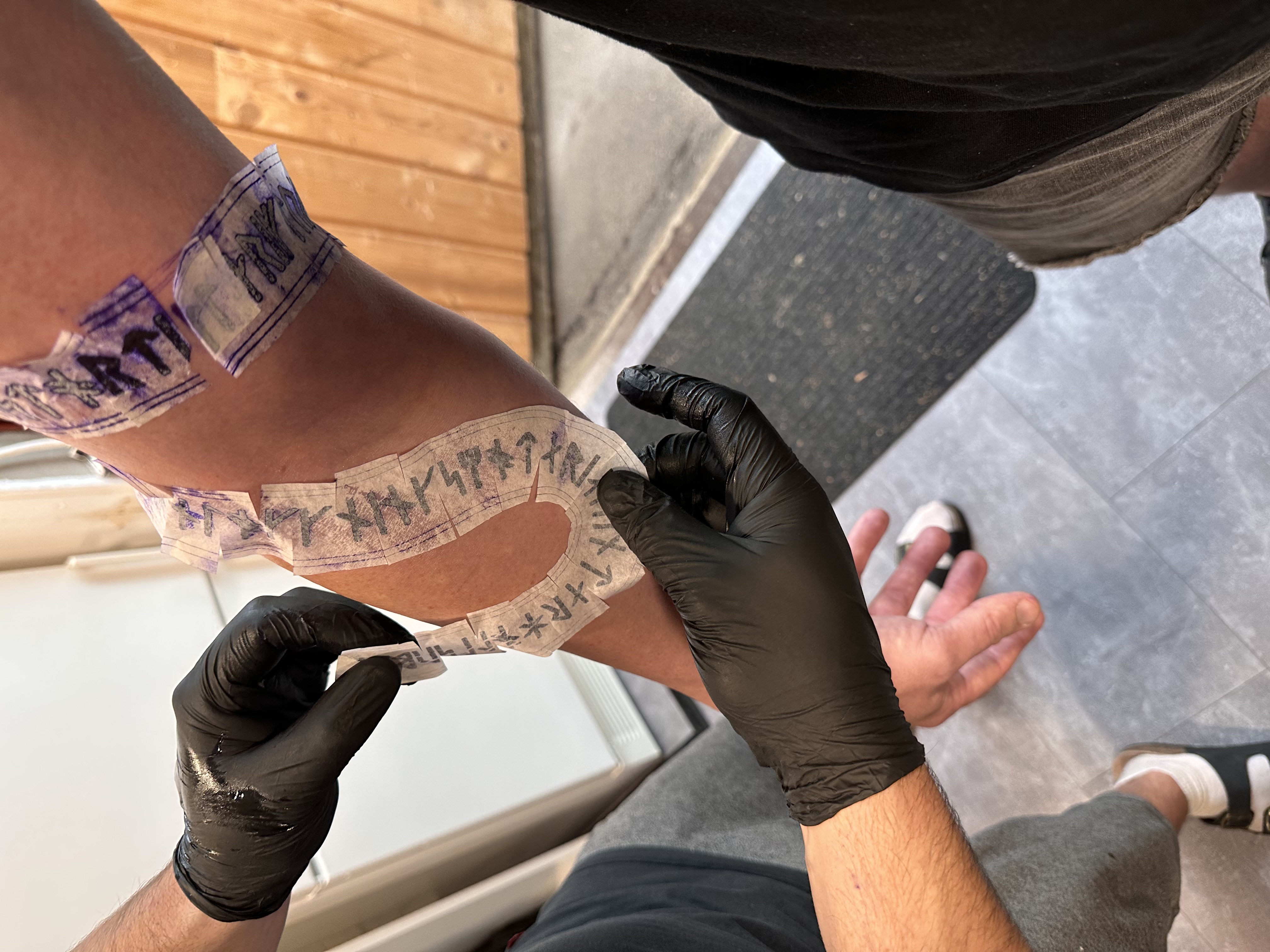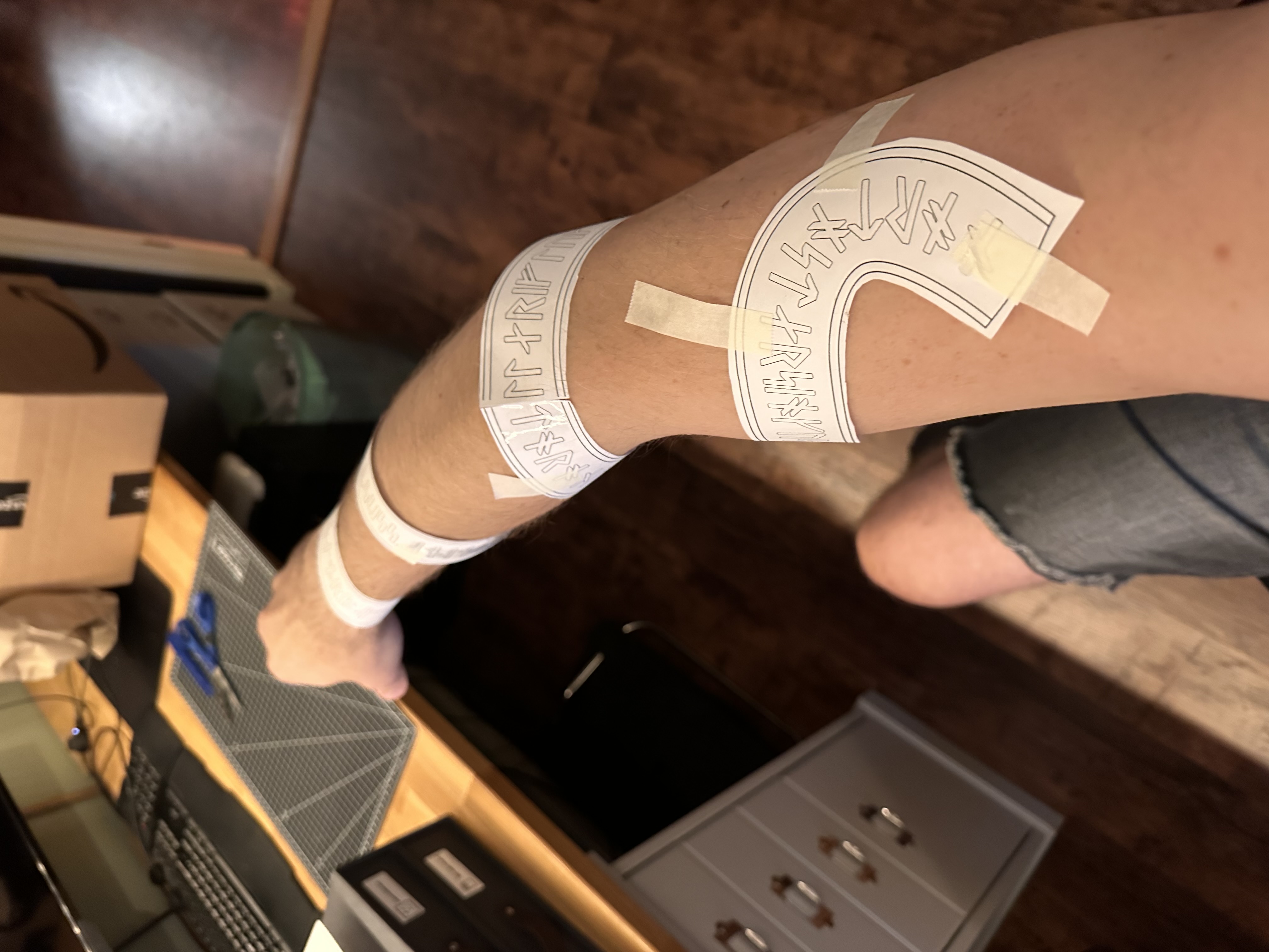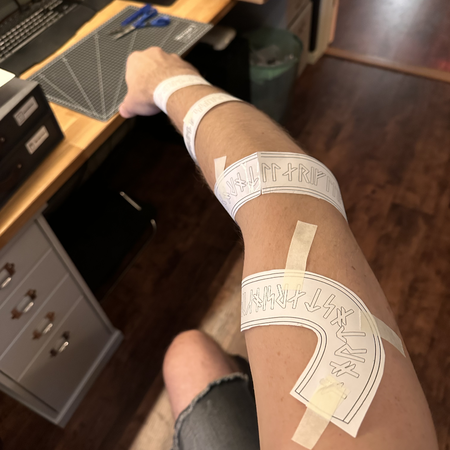 Så var över till honom så vi fick testa lite hur formen skulle vara med hjälp av tejp och lite klurande. Men då texten är väldigt specifik så tog jag den tejpen/formen och gjorde en "ren" version av den i datorn och skrev ut den i olika delar som passade ihop runt armen medan han tog fram ett huvud till ormen som jag gillade.