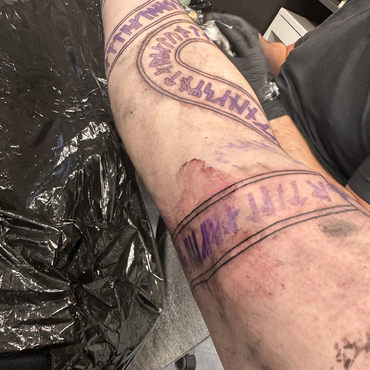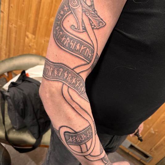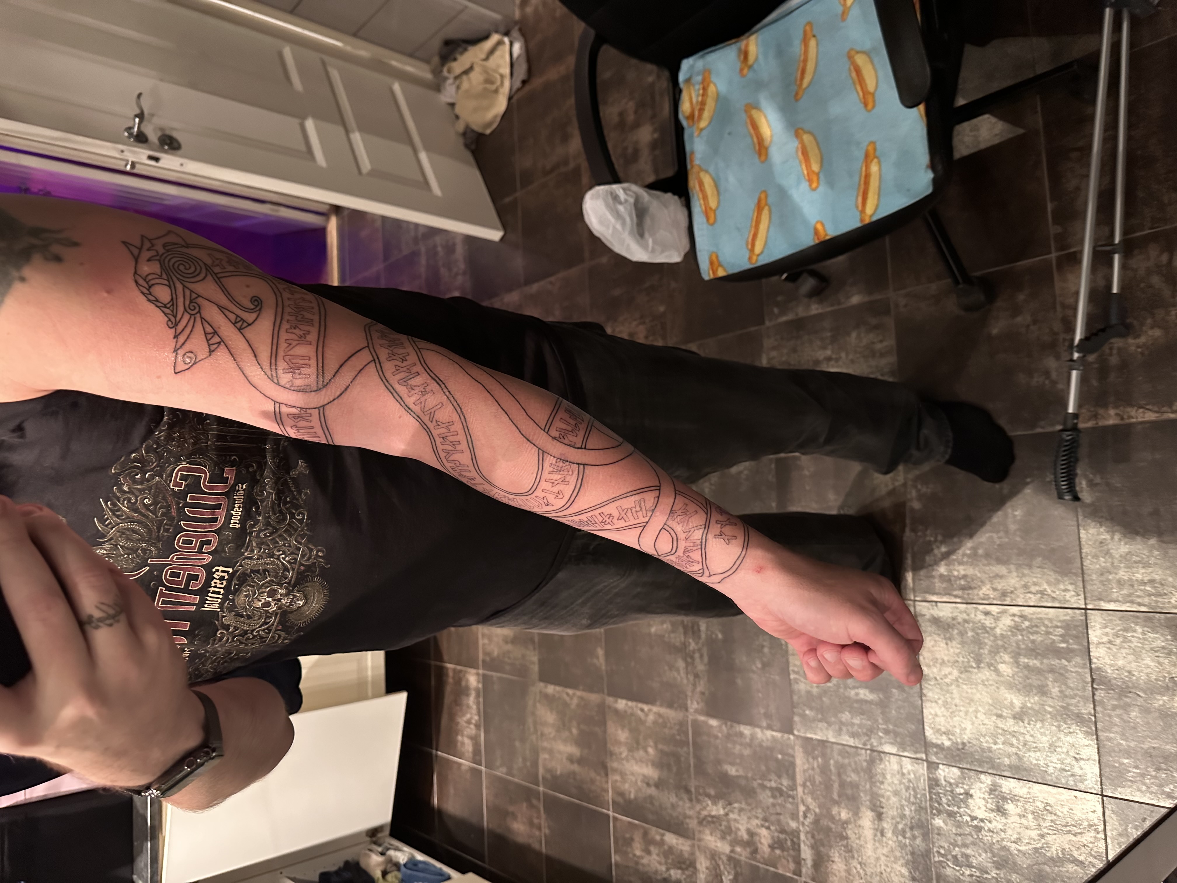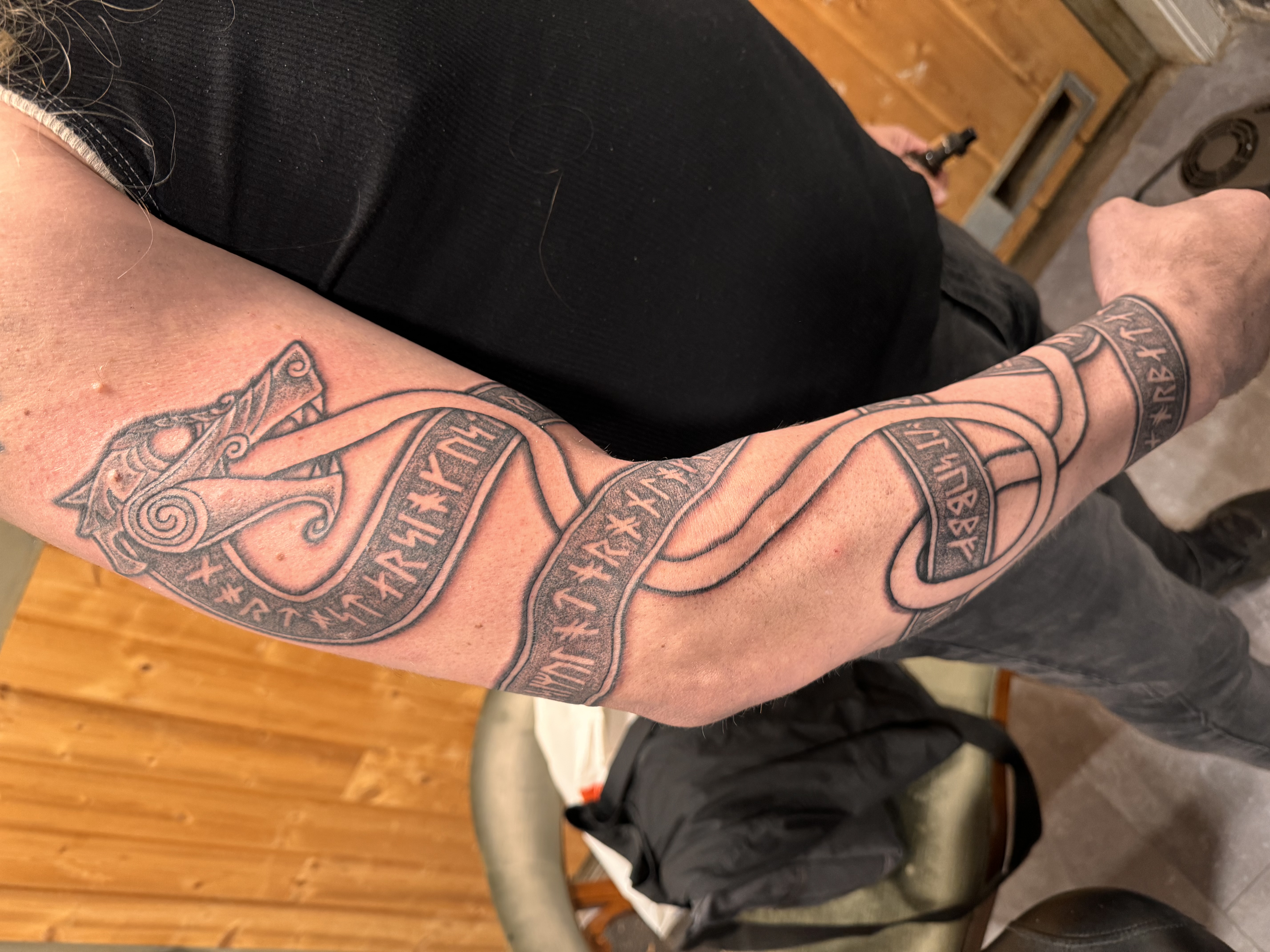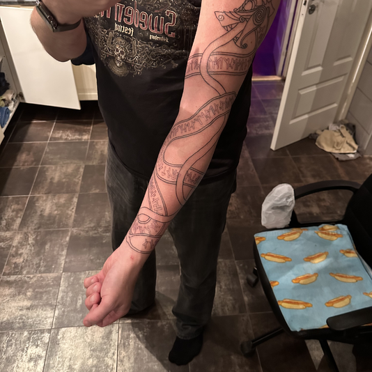 Eftersom det är mitt "partytrick" att kunna det här utantill så var tanken att ha hela ordet skrivet runt armen fast översatt till runor och på kroppen av midgårdsormen. Jag tog fram en skiss och skrev ut den. Den blev över en meter lång och jag virade den runt armen och tyckte det såg himla fränt ut.