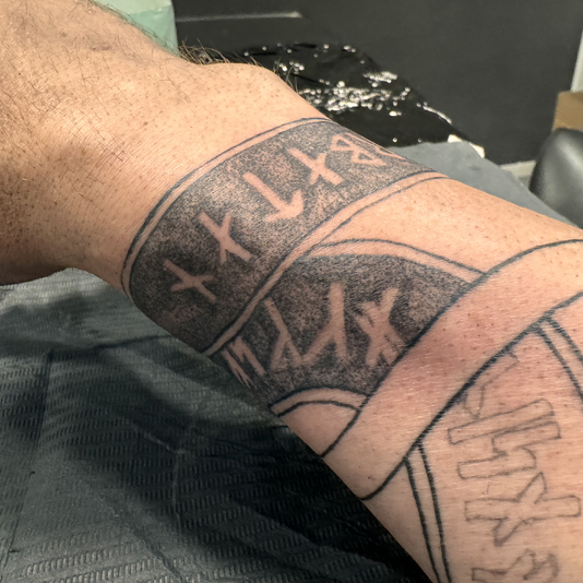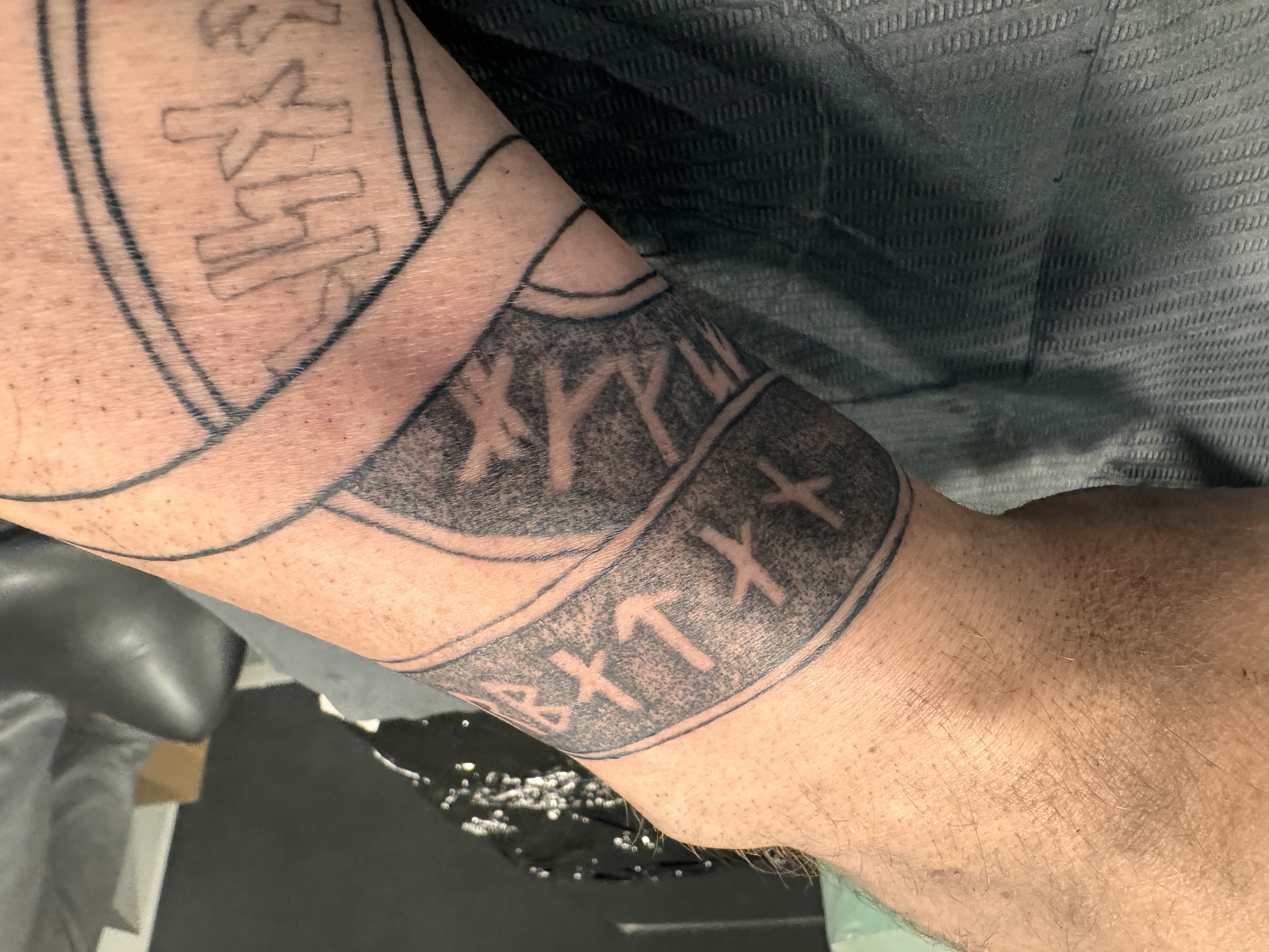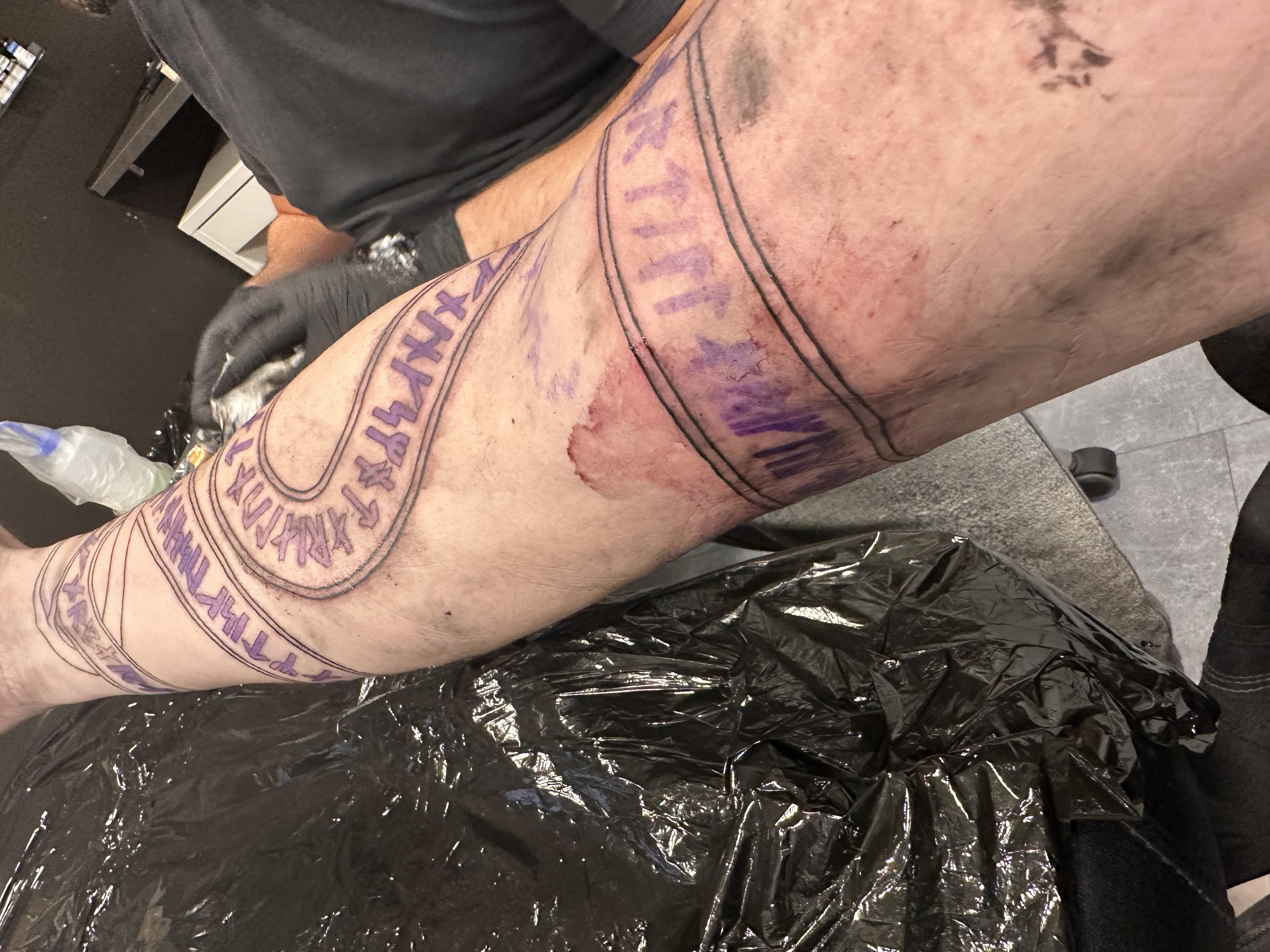 På så sätt så kunde första sittningen bli att fixa alla konturer. vilket tog typ sex timmar, varav en hel del tid gick åt att sätta på stencilen och fixa vart allt ska vara. Och herregud på undersidan av armen är det INTE skönt att bli tatuerad på! Sen nere vid handleden på undersidan, damn!