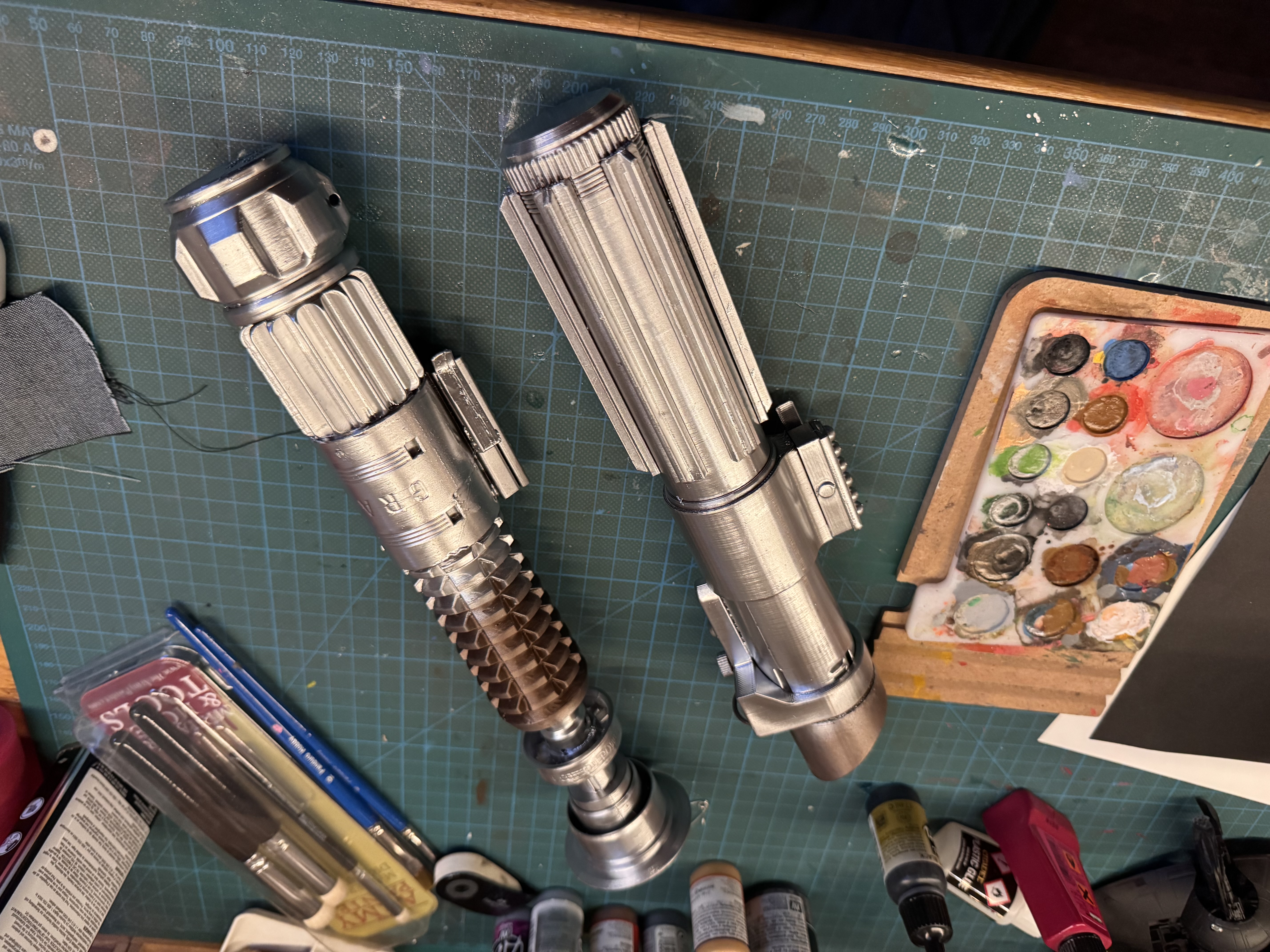 En av de roligaste delarna av projektet har varit att skriva ut ljussabelhandtagen och måla dem.