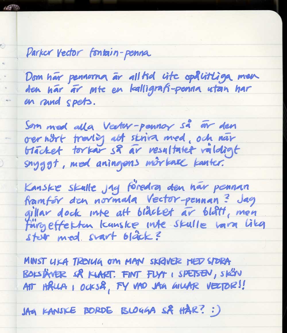 Jag älskar älskar älskar Parker Vector och skaffade nyss en fontänvariant av den. Till skillnad från en tidigare jag har så är detta ingen kalligrafipenna dock.