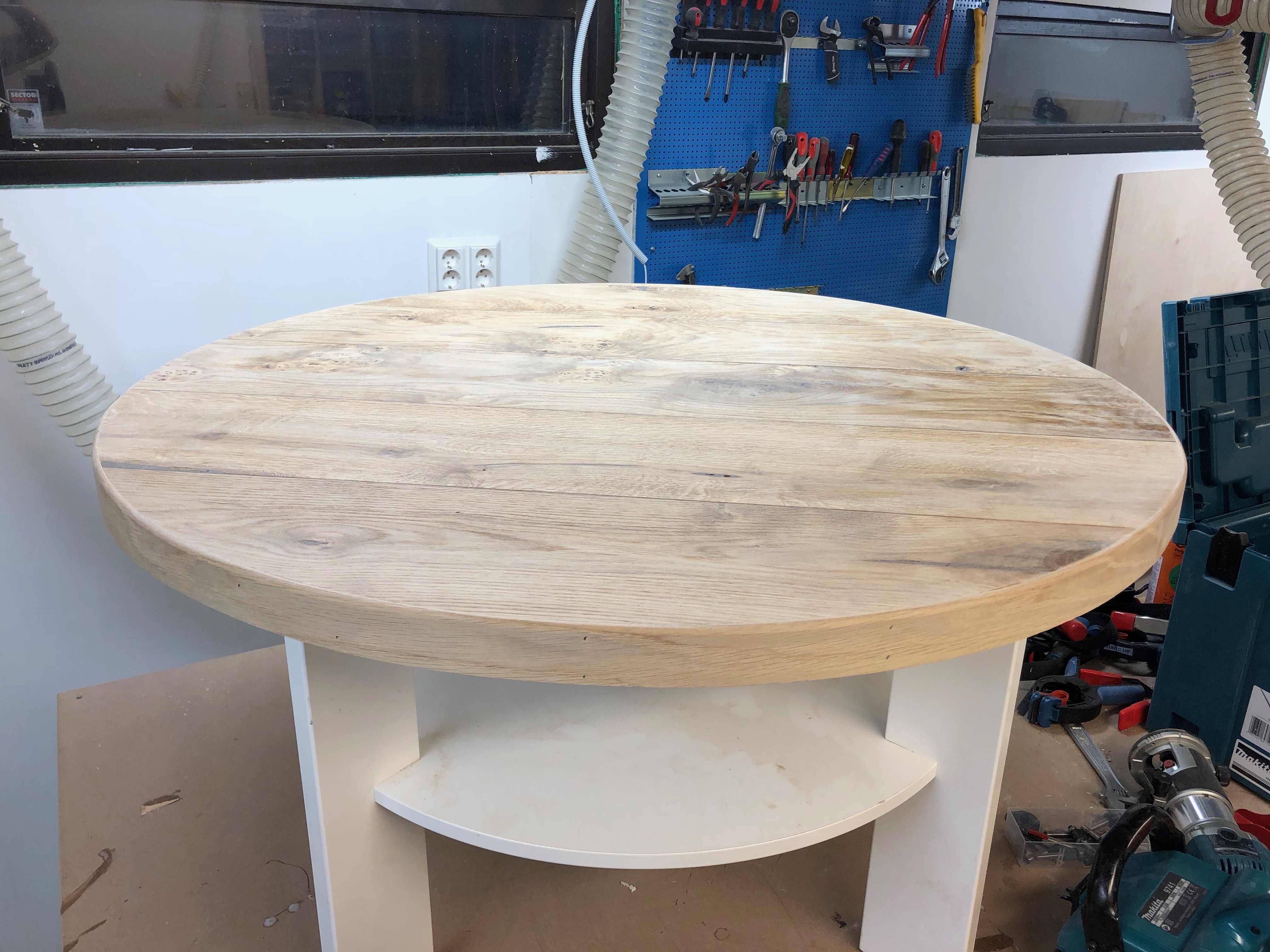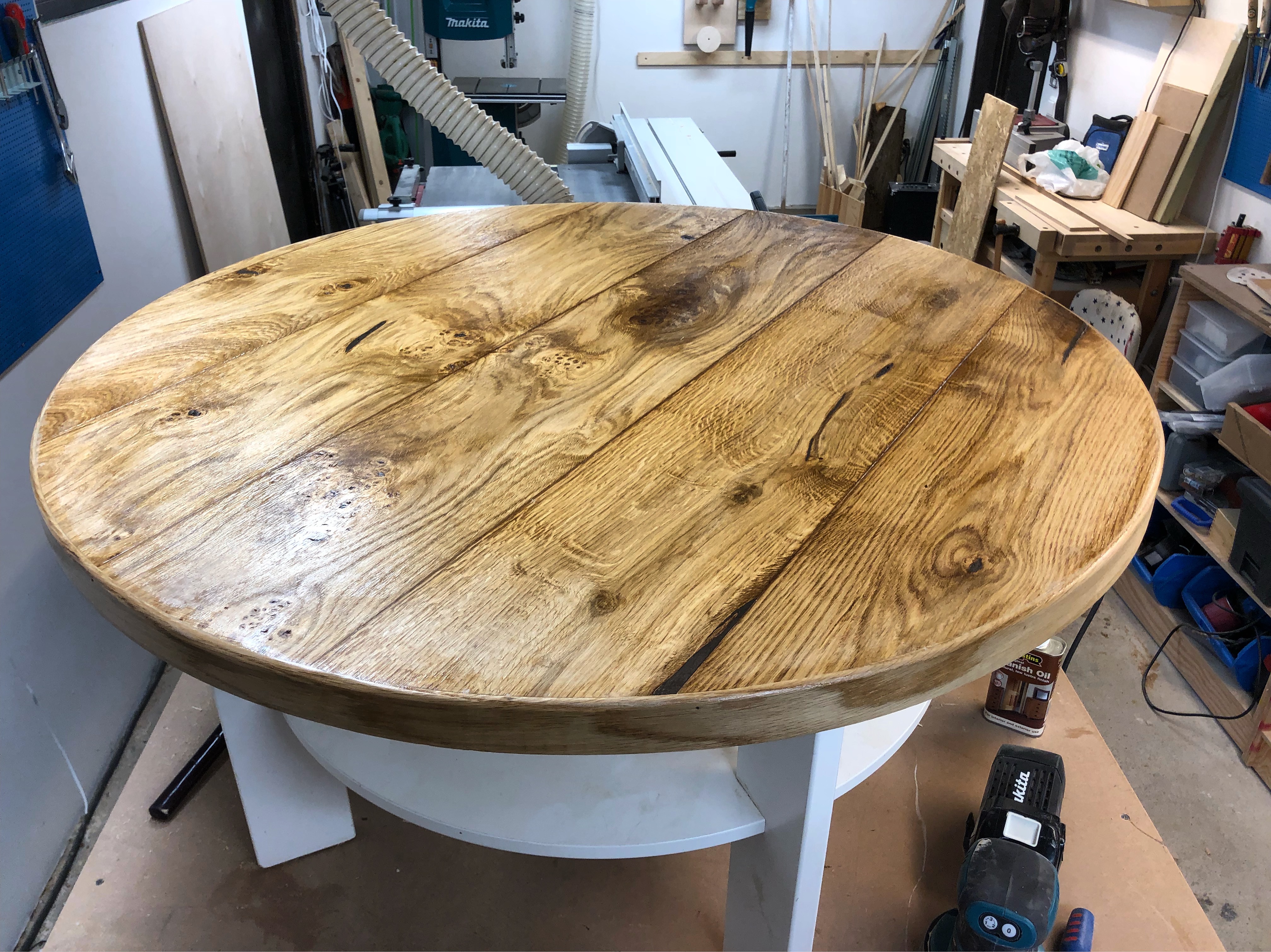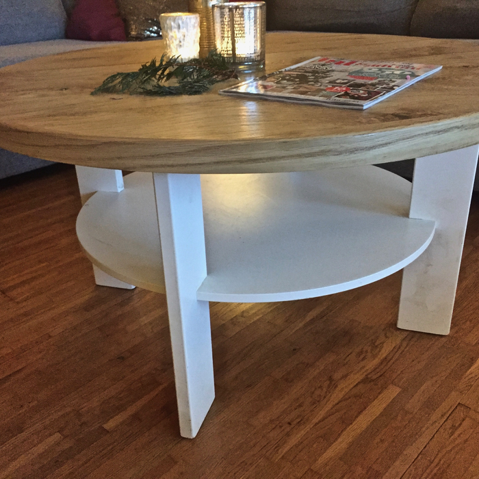 Vi hade ett vitt runt vardagsrumsbord innan jag byggde vårt nya och det har stått och samlat damm en bra stund. I och med att jag röjde i garaget efter min verkstadsrenovering så var det dags att fixa i ordning det.