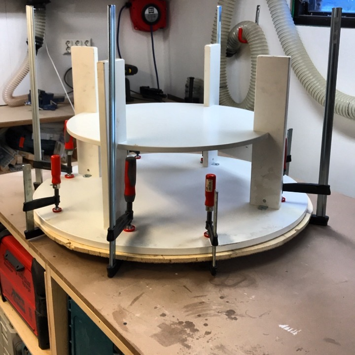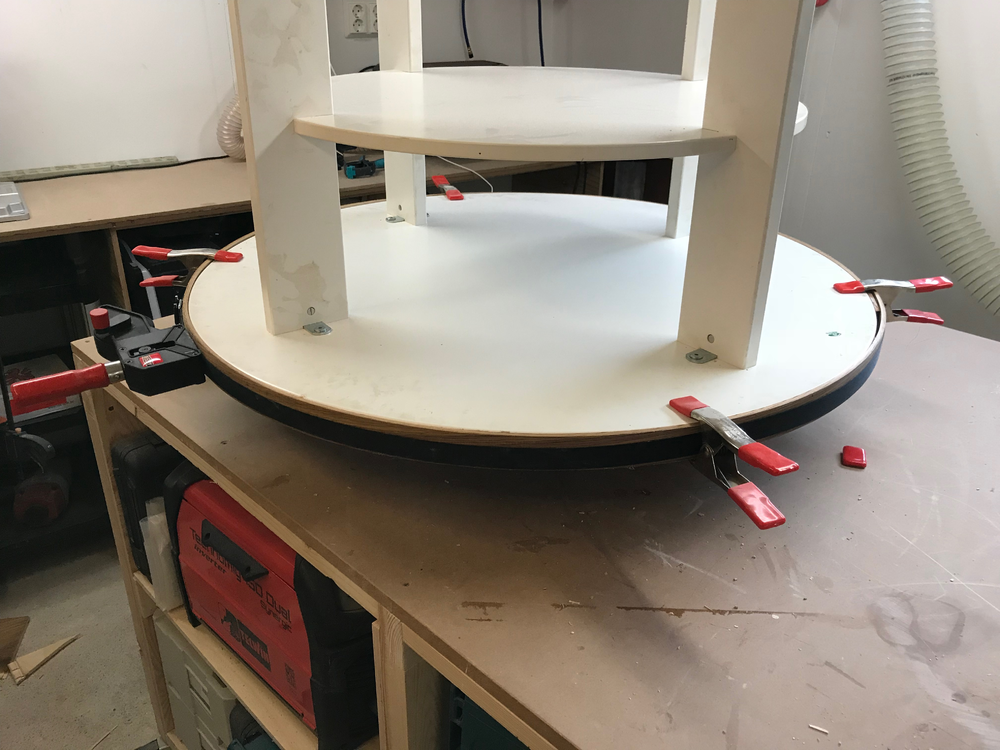Sen spänna fast det runt bordet så det torkar i den formen, när det är torkat så limmas det fast på kanten
