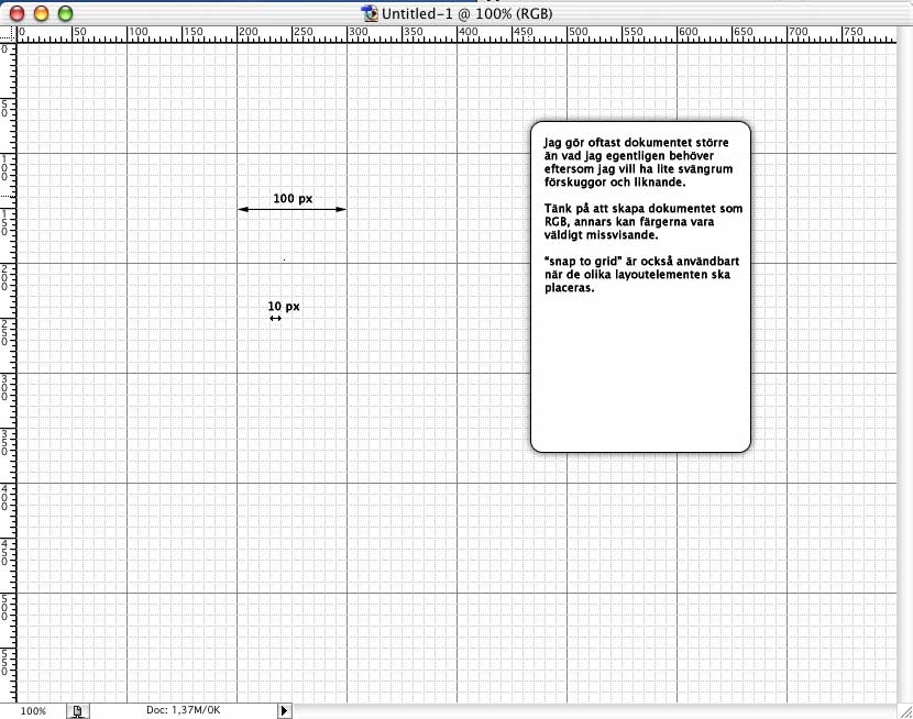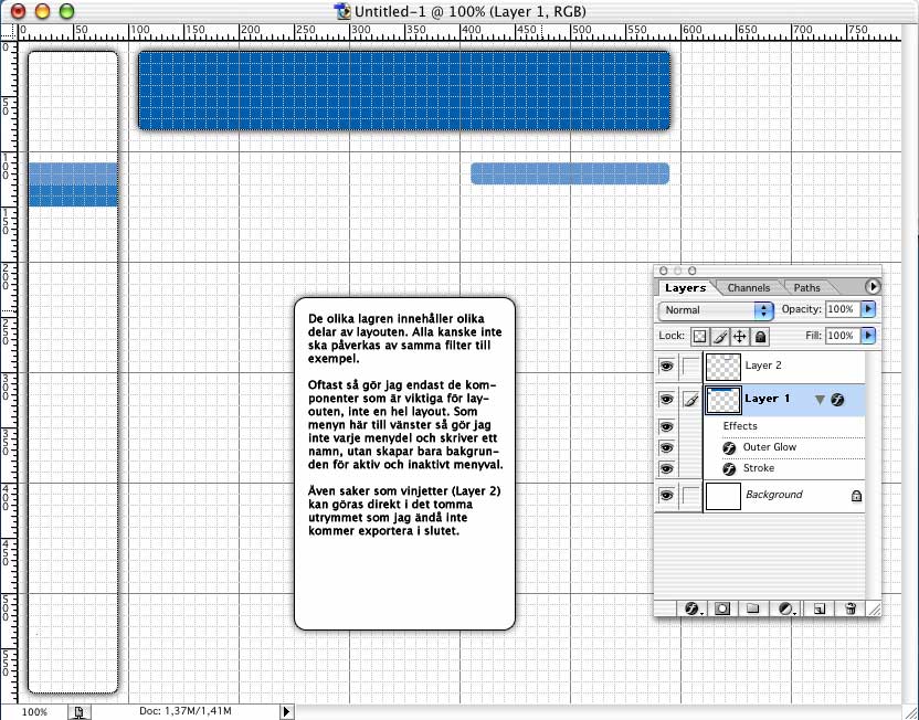 I alla fall - tillbaka till PhotoShop! I mitt nya blanka dokument så sätter jag först på rutmönstret (grid:en) som jag har satt till linje var hundrade pixel och 10 underuppdelningar, vilket betyder att jag lätt kan se var tionde och var hundrade pixel. Detta är ovärderligt i min layoutprocess (och det stör mig rätt rejält att ImageReady inte har en grid). Med rutmönstret framme så skapar jag till exempel vita fyrkanter med rundade hörn i olika storlekar på ett nytt lager, som i sig ska utgöra grunden för layouten.