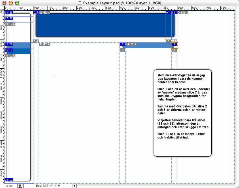 En annan fiffig sak i PhotoShop och ImageReady är "slices", ett verktyg som gör att man kan markera vissa delar av en bild och sedan spara ut dem separat. Detta är viktigt i webdesign - då en layout oftast består av komponenter istället för en hel bild. Med detta verktyg markerar man de delar som är separata delar i layouten, såsom ändbiten på en tabell som ska utgöra menyn, eller kanske hörnbitarna i en ruta som ska ha flexibel storlek.
