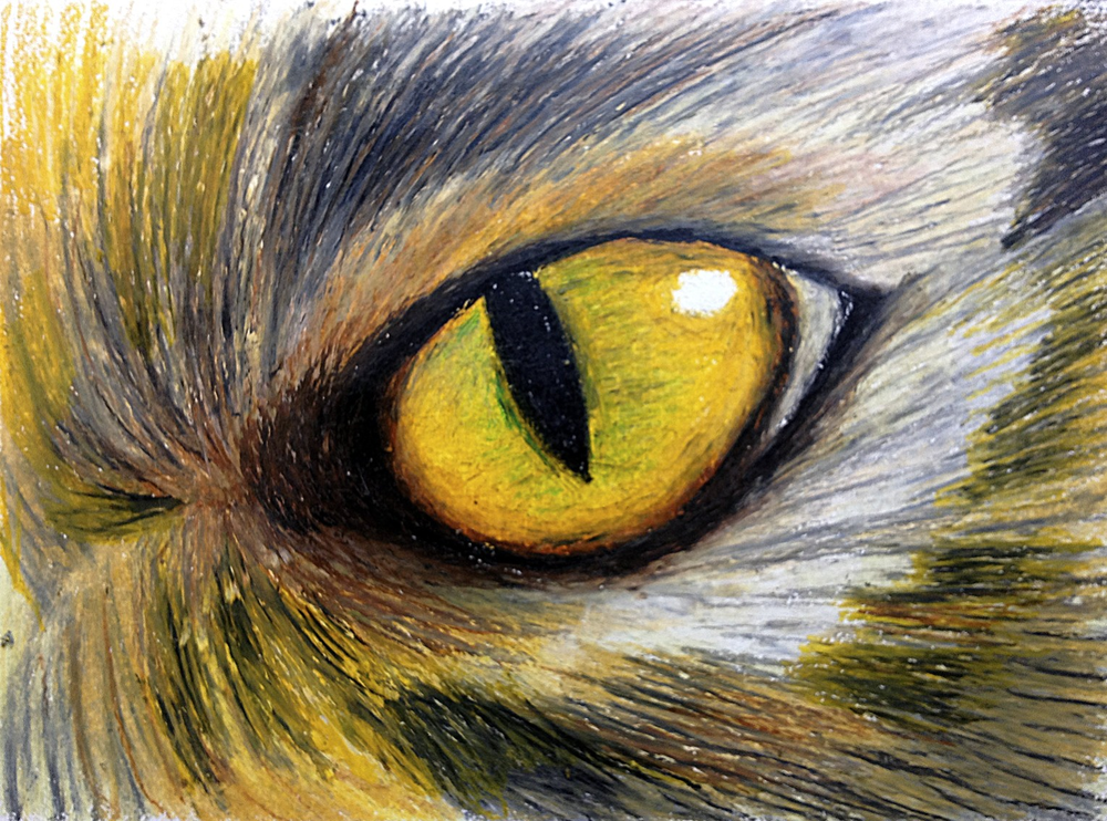 Dagens teckning blir en hemifrån. Fick nya oljepastellkritor och testade lite med dem på ett akrylpapper, det fungerade så där. Smulade mycket och hade svårt att få något riktigt flyt, och det blev mest kladdigt. Det ska likna Eye of the Cat, men det gör det inte direkt.