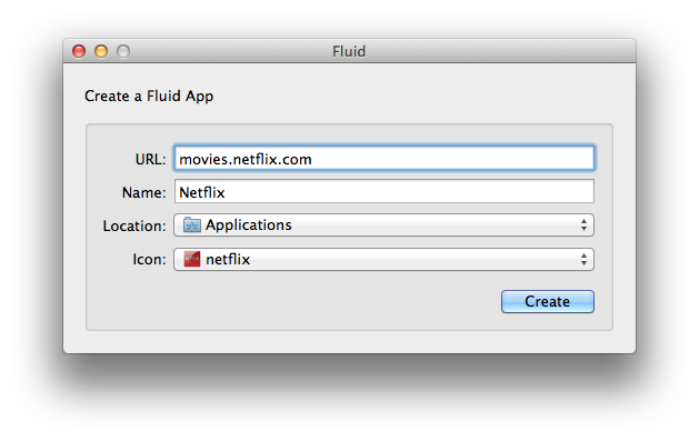 Då ser du detta, där fyller du i "movies.netflix.com" som adress, kallar den Netflix, sparar den i din program-mapp och pang, klart! Om du vill kan du använda bilden till höger som ikon för programmet, annars använder den favico-filen och det ser apa ut.