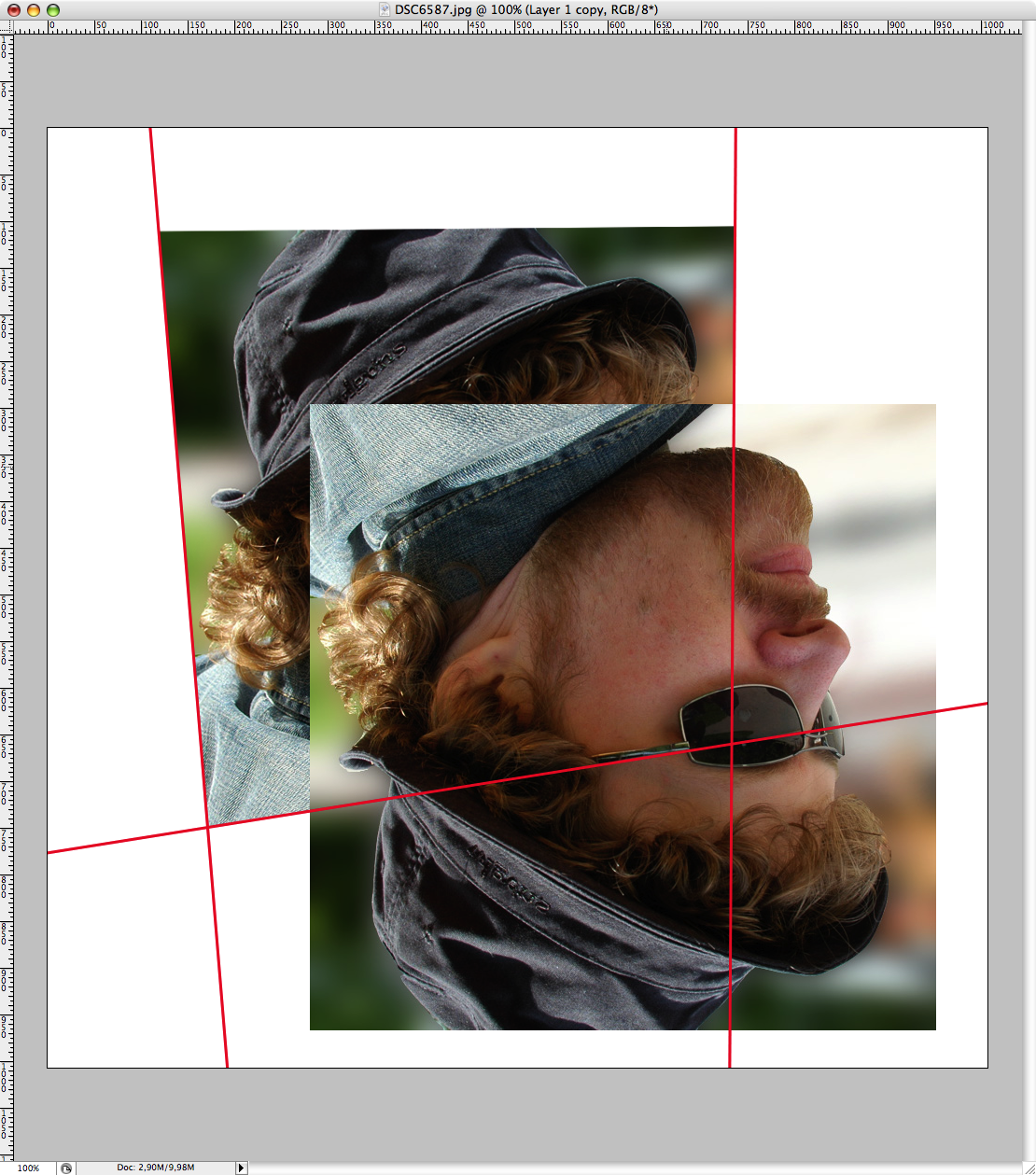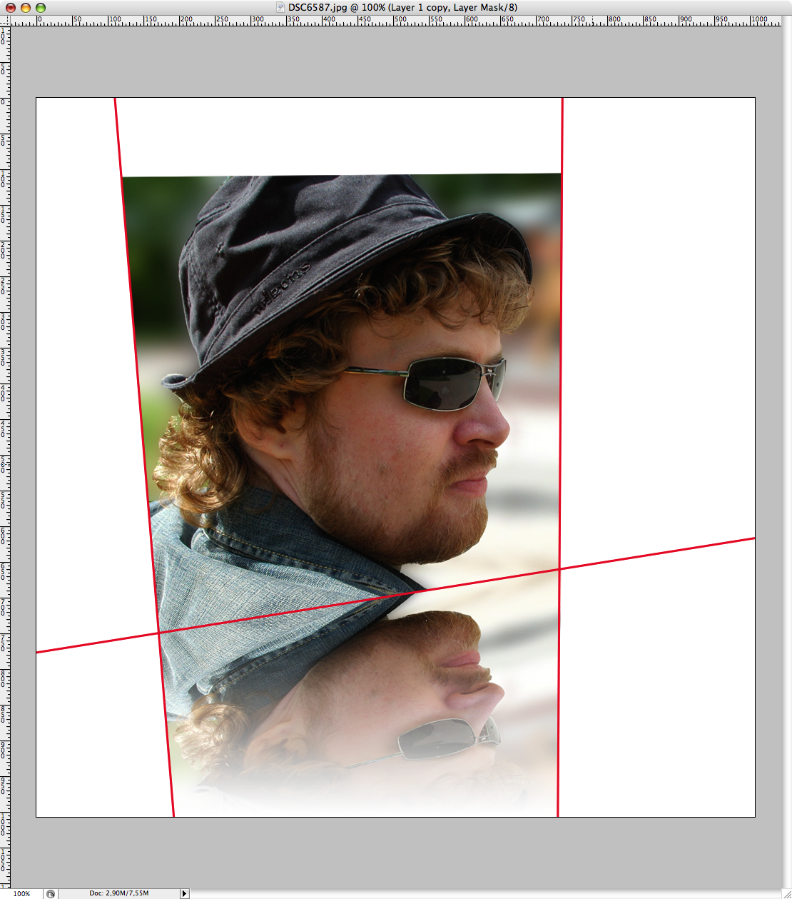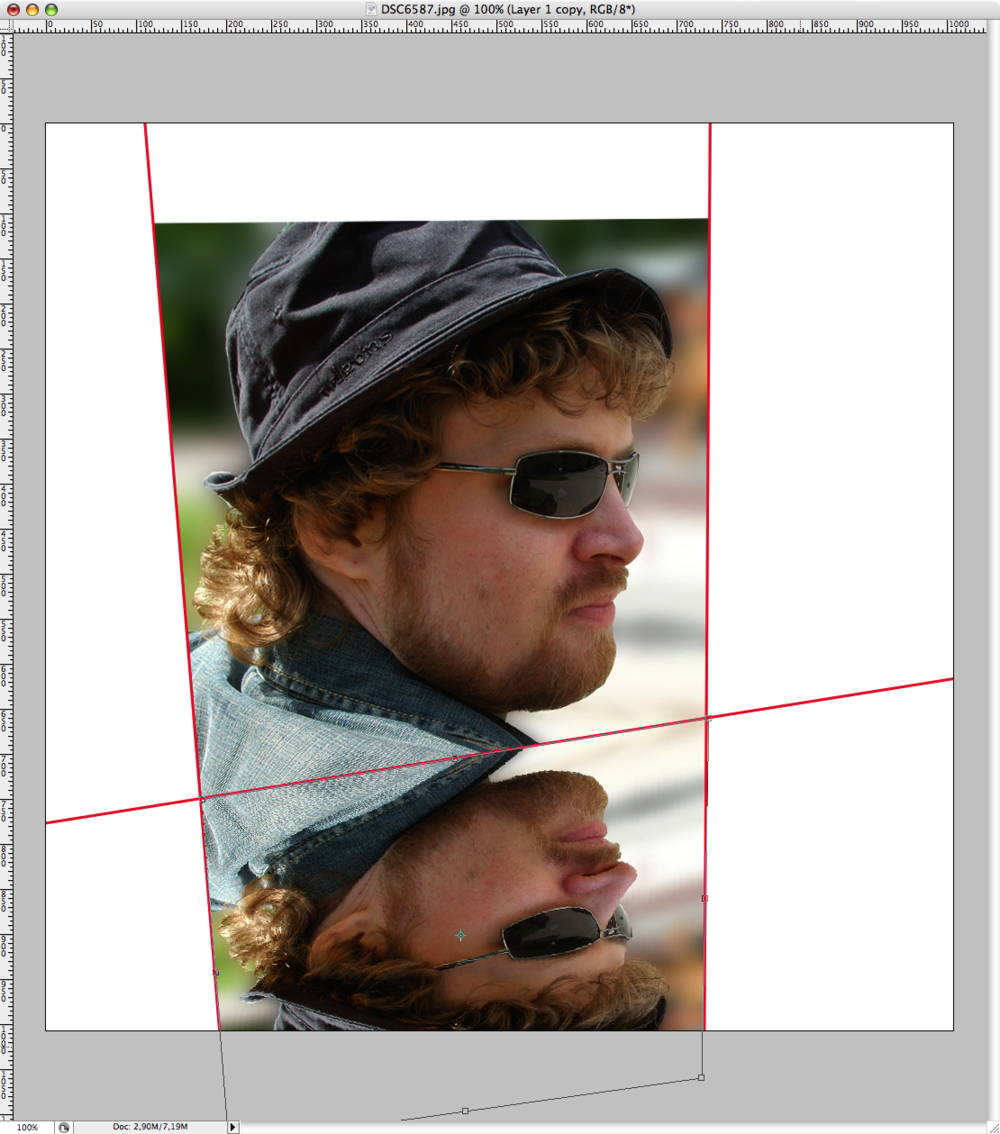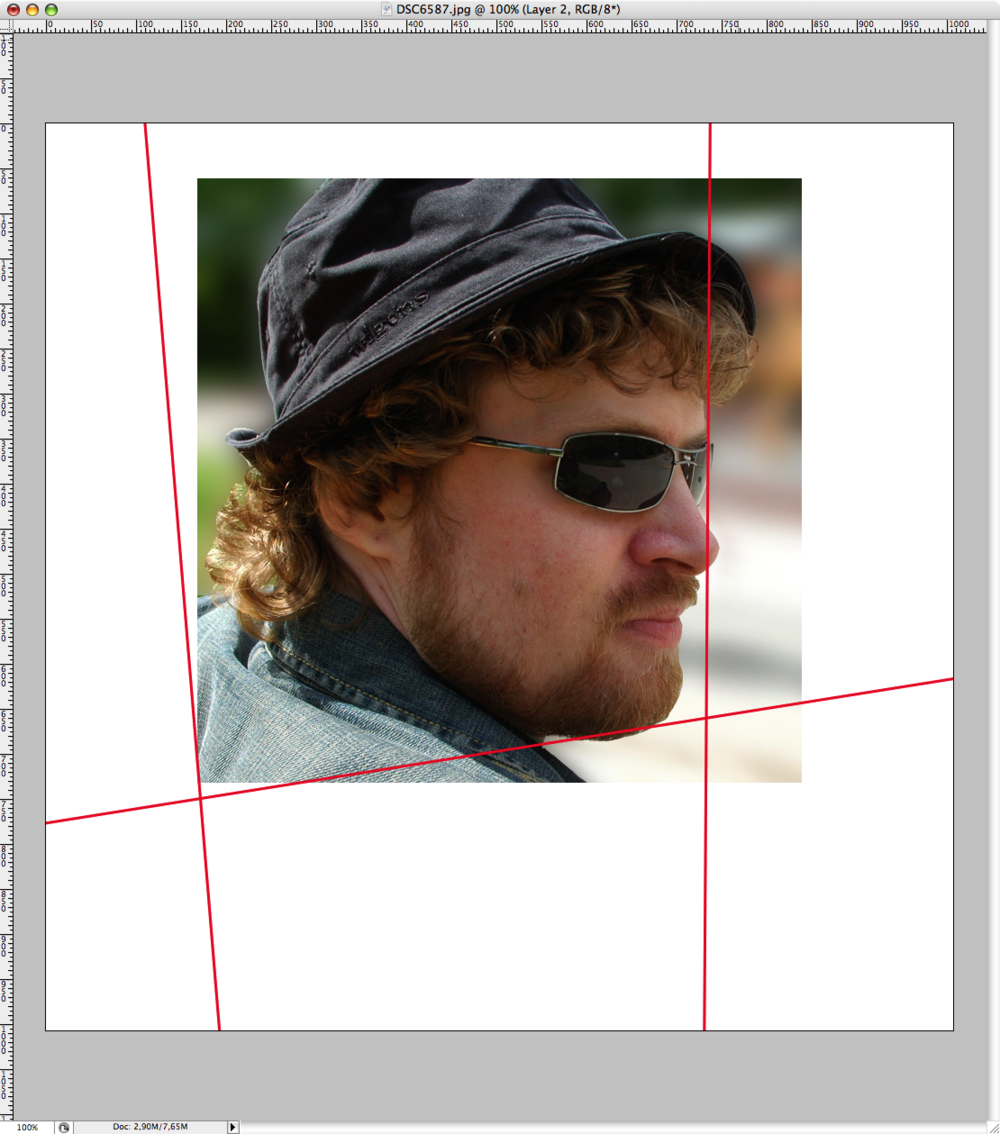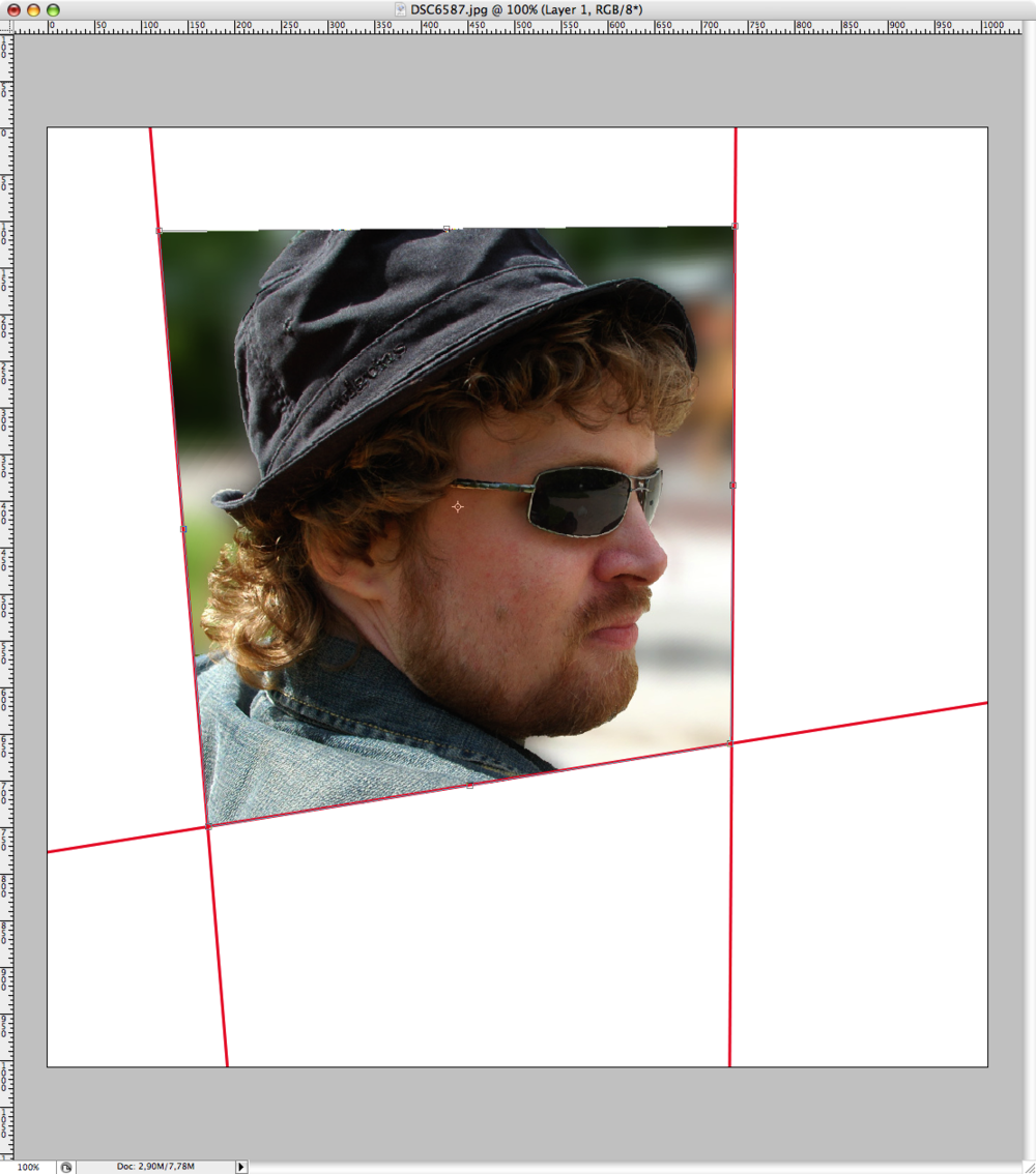 Nu väljer du lagret med originalbilden. Sedan Edit->Free Transform. Håll nere äpple-tangenten (sorry, vet inte vilken det är på en PC, prova dig fram) och dra i varje hörnpunkt så att du passar in bilden till stödlinjerna. Se till så den känns proportionerlig. I mitt fall så ska alltså vänster nedre hörn vara under höger nedre hörn men vänster övre hörn ska vara högre (eller i samma höjd) som det övre högra hörnet. Allt för att "fejka" en perspektivkänsla.