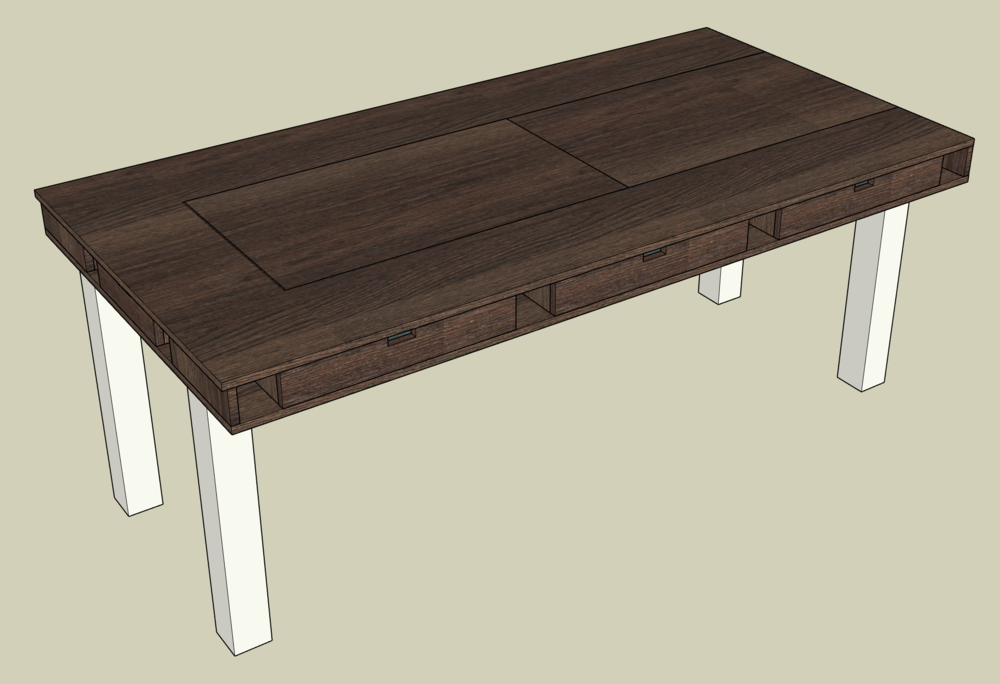 Jag har en idé för ett spelbord som ska stå i vardagsrummet. Det blir mer och mer brädspel här hemma och något som de flesta spelbord har är att i mitten är det en nedsänkning där spelplan och sådant kan vara. Men det vore ju sjysst att kunna använda det som ett vanligt bord med, så därför är tanken att normalt ser det ut så här.