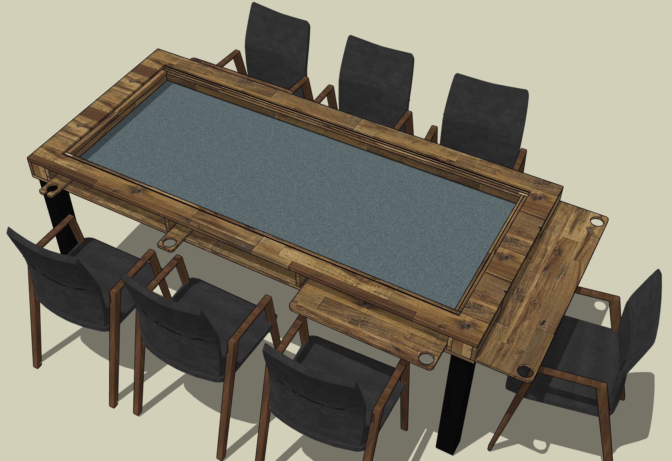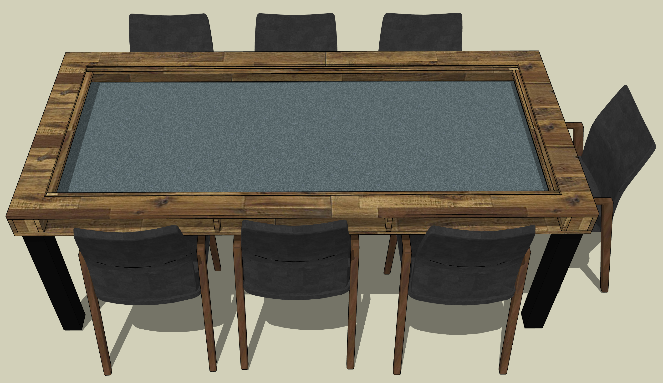 Sargen går nu också hela vägen in i kortsidan så man faktiskt kan sitta sju personer och ha lika mycket utrymme. Det är också en ny list som går runt hela insidan av sargen som locken vilar på. Den sargen ska ha ett spår som löper runt hela bordet så man kan sätta kort i spåret. Under den listen sitter det också en LED-list för belysning av bordsytan.