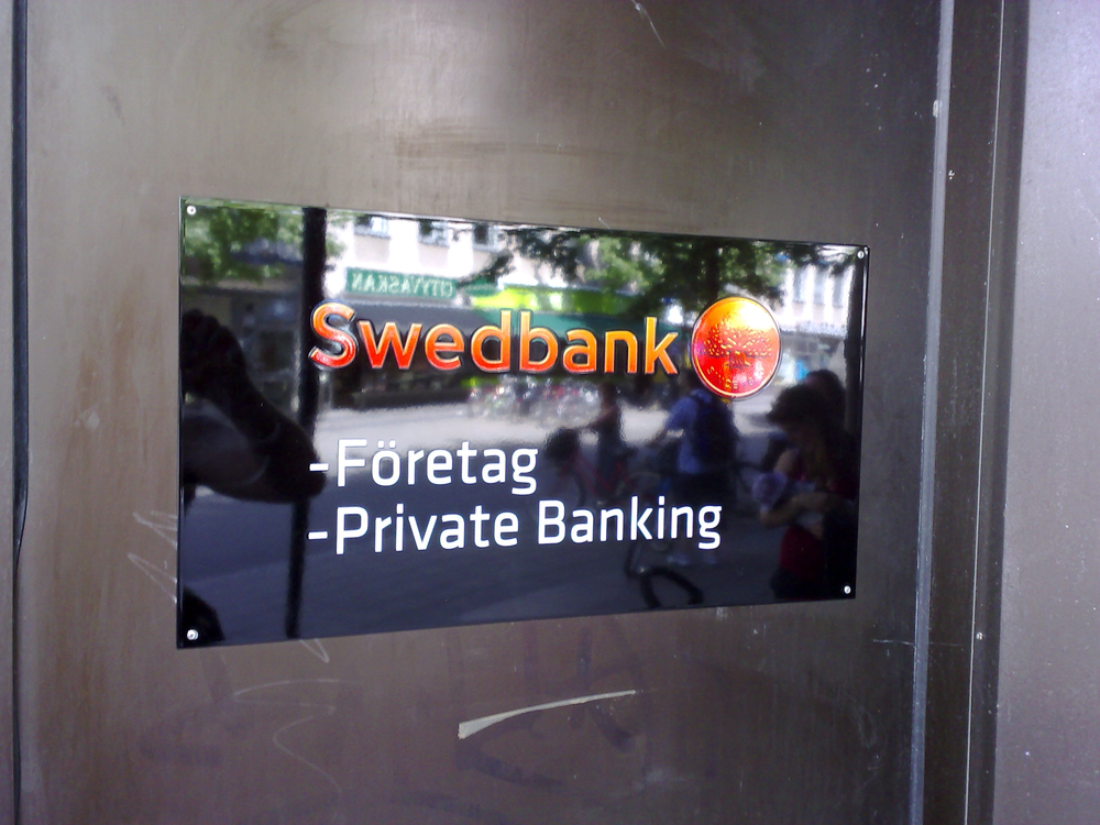 Skickar med en lite skojig bild från Swedbank här i stan. Vad är poängen med detta? Vi skriver ena raden på svenska men den andra på engelska? Hallå i huvudet?