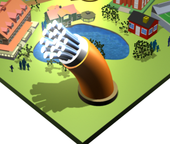 Illustration av en stad i 3D, en variation av en tidigare illustration, denna med en fet fiberkabel som kommer upp ur marken.