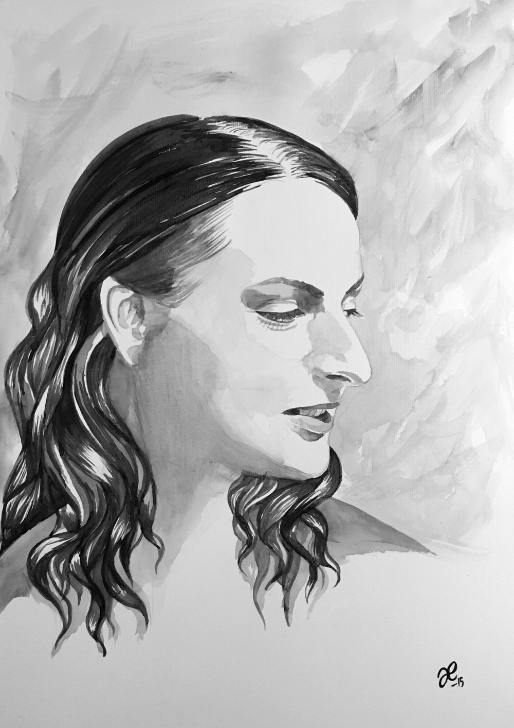 Akvarellporträtt på Tinas syster Tania på A3-papper. Ville öva mer på hår så hon fick lockigare hår än vad hon normalt har.