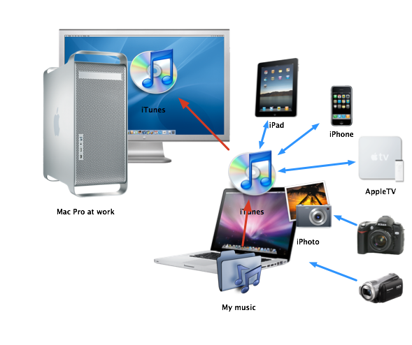 Så detta är ganska mycket min setup nu. Jag har all min musik (ca 60 GB) och alla mina bilder (över 20k fotografier) på min Macbook Pro och detta är min Digital Hub. Alla de blå linjerna är apparater som jag synkronisera eller importerar till min laptop. Detta är en jättebra lösning eftersom jag har alla mina media med mig, och jag kan sitta i soffan hemma och redigera hemfilmer (vilket jag aldrig gör, men jag kan). Den röda linjen som går från iTunes till min Mac Pro i arbetet är den inbyggda delningsfunktion i iTunes som visar min laptop i iTunes på min Mac Pro och jag kan lyssna på musik (men inte redigera spellistor och liknande).