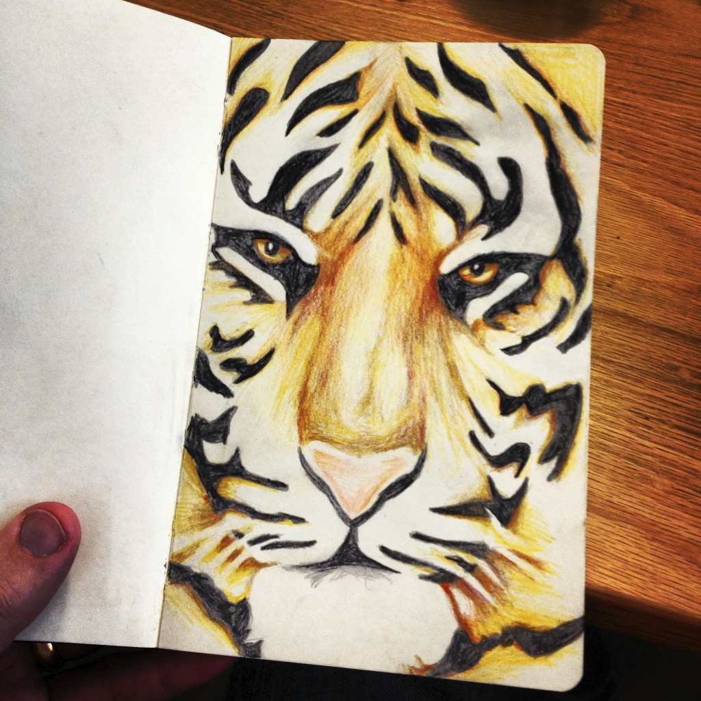 Dagens teckning är en tiger, som synes. Ritad med mina gamla Stabilopennor på Moleskines Sketchbook-variant av deras anteckningsbok. Sjukt bra färgpennor det där. Jag har beställt ett set med Faber Castell's Polychromo-pennor, så ska jag jämföra lite och kanske skriva om det sen, kanske något som skulle finna det intressant.