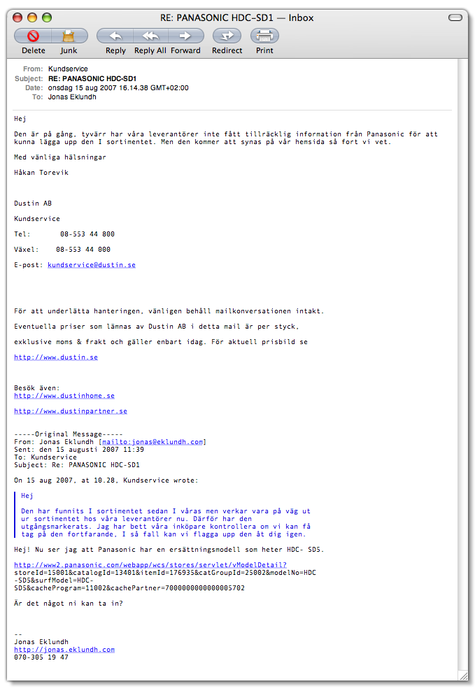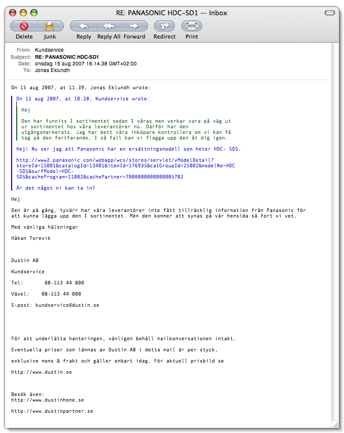 Hade hans mail sett ut som ovan så hade mitt svar sett ut så här. Jag hade enkelt bara klippt bort hans signatur och lagt till mitt svar. Enkelt, smidigt och med bra mycket mindre onödig text mellan innehållet i mailen.