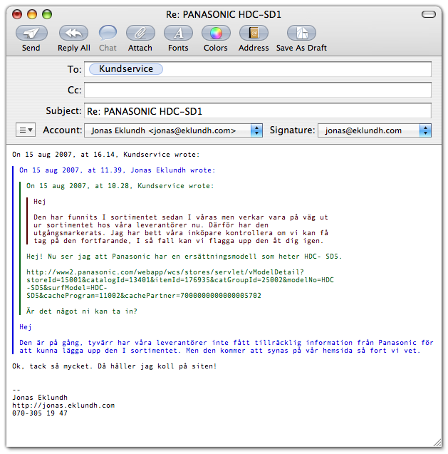 Det här är ett typiskt mail nu för tiden. Klicka på bilden så ser ni hur det ser ut. Helt otroligt stökigt. Jag måste scrolla ned till botten för att se vad det är han svarar på och sen scrolla upp igen för att fortsätta läsa. Detta är det lata sättet att svara på mail. Bara lägga till svaret ovan utan relation till vad man svarar på i mailet under. Noter att min fråga till honom finns allra längst ned i mailet och hans svar allra längst upp. Och i mitten så finns tidigare mail. Krävs en hel del detektivarbete för att lista ut vem som svarar på vad här. När jag svarar på ett sådnat här mail så städar jag alltid upp det så svaren kommer i rätt ordning, vilket är detta: