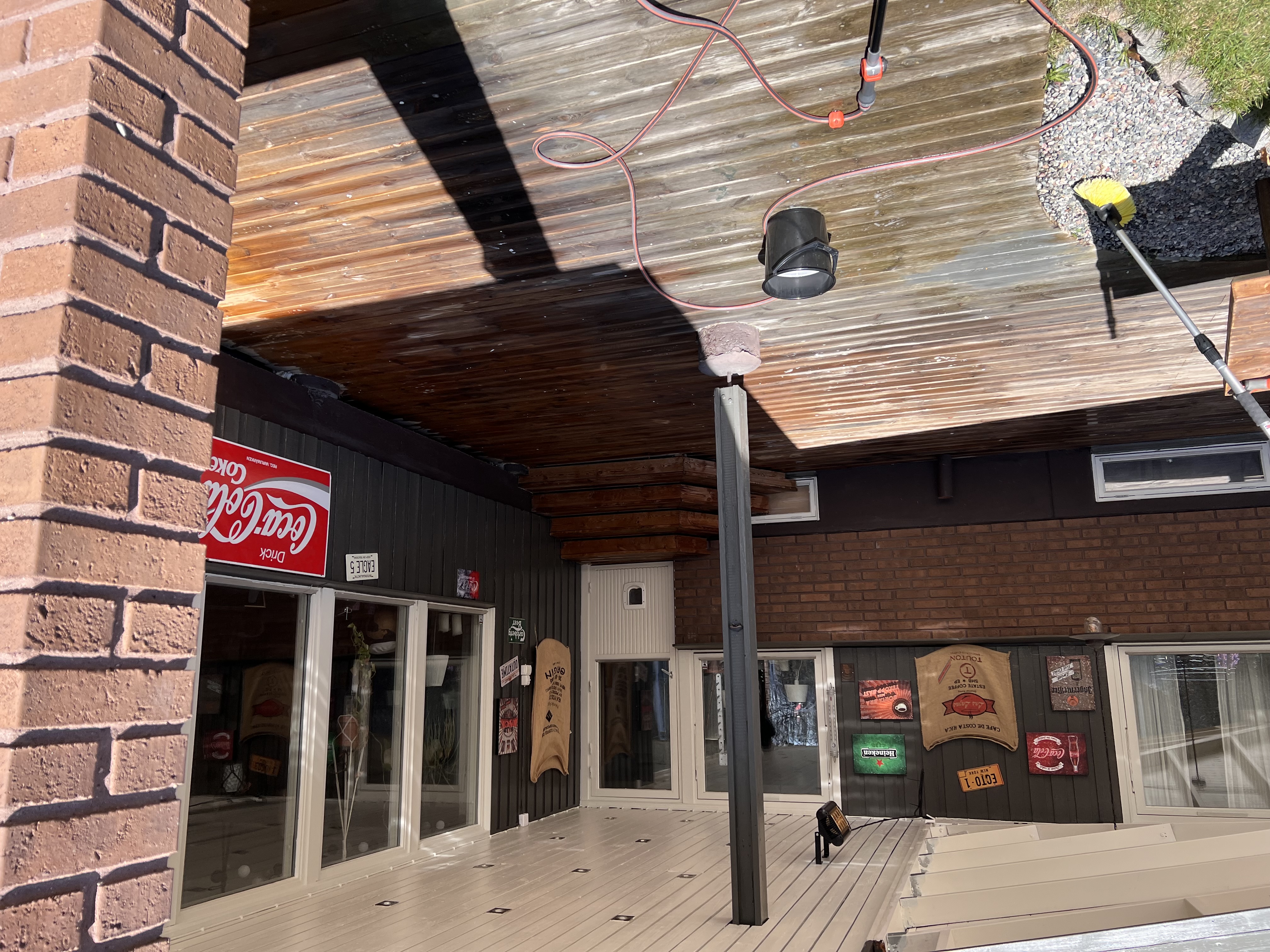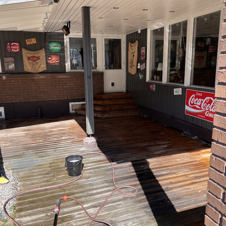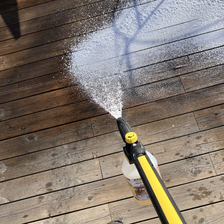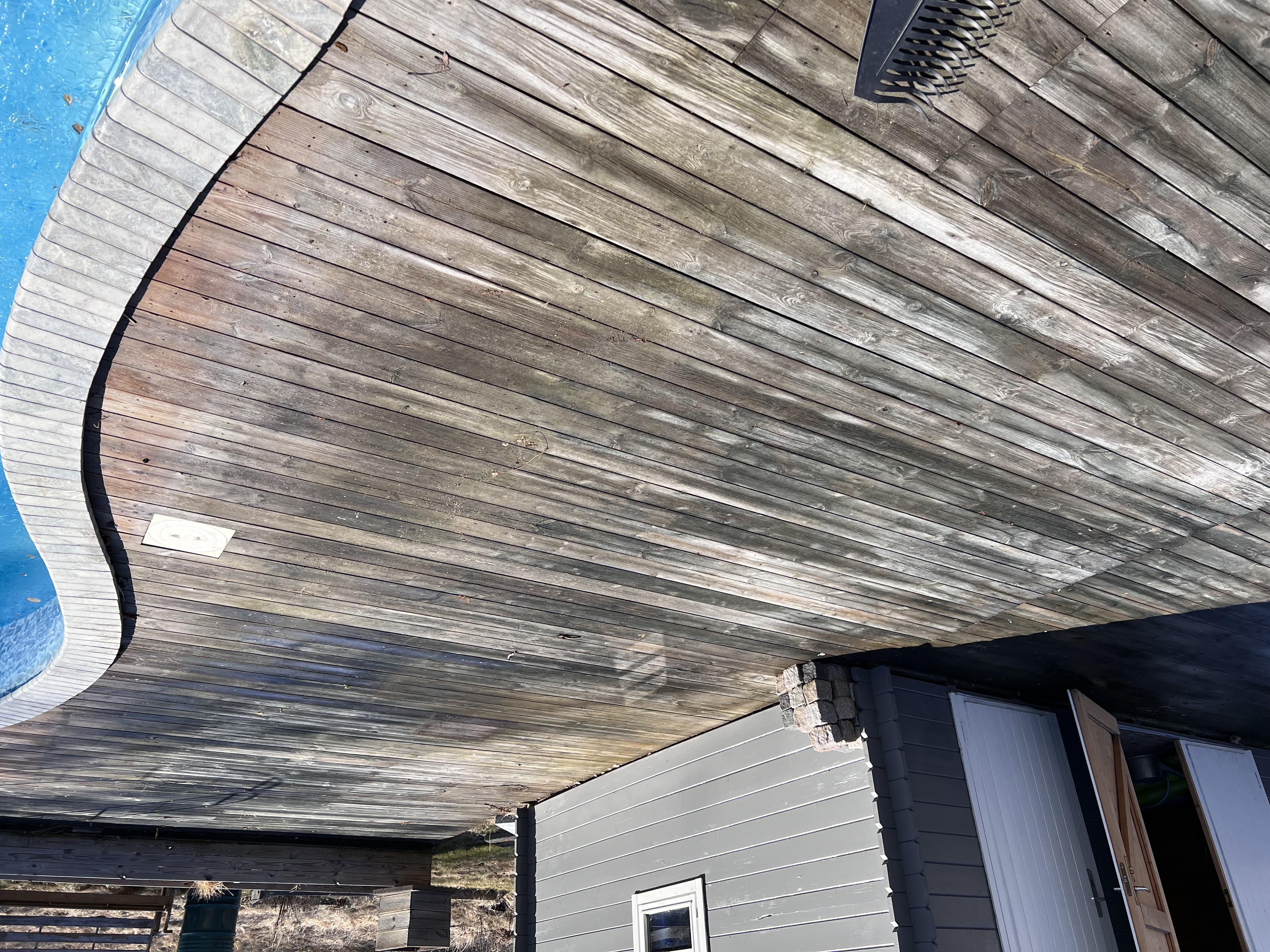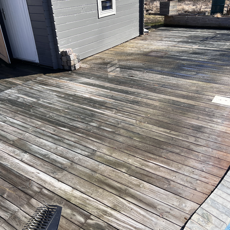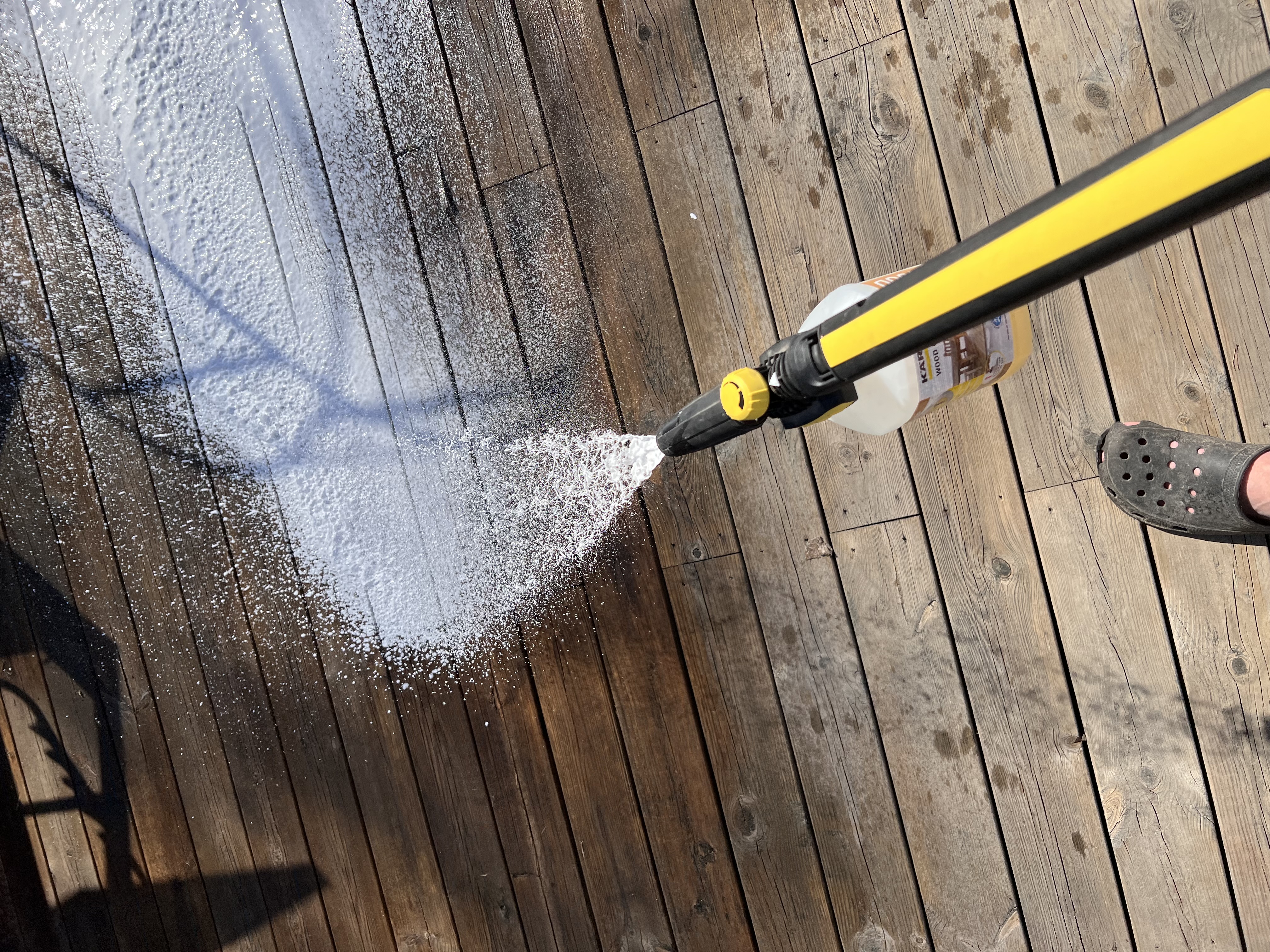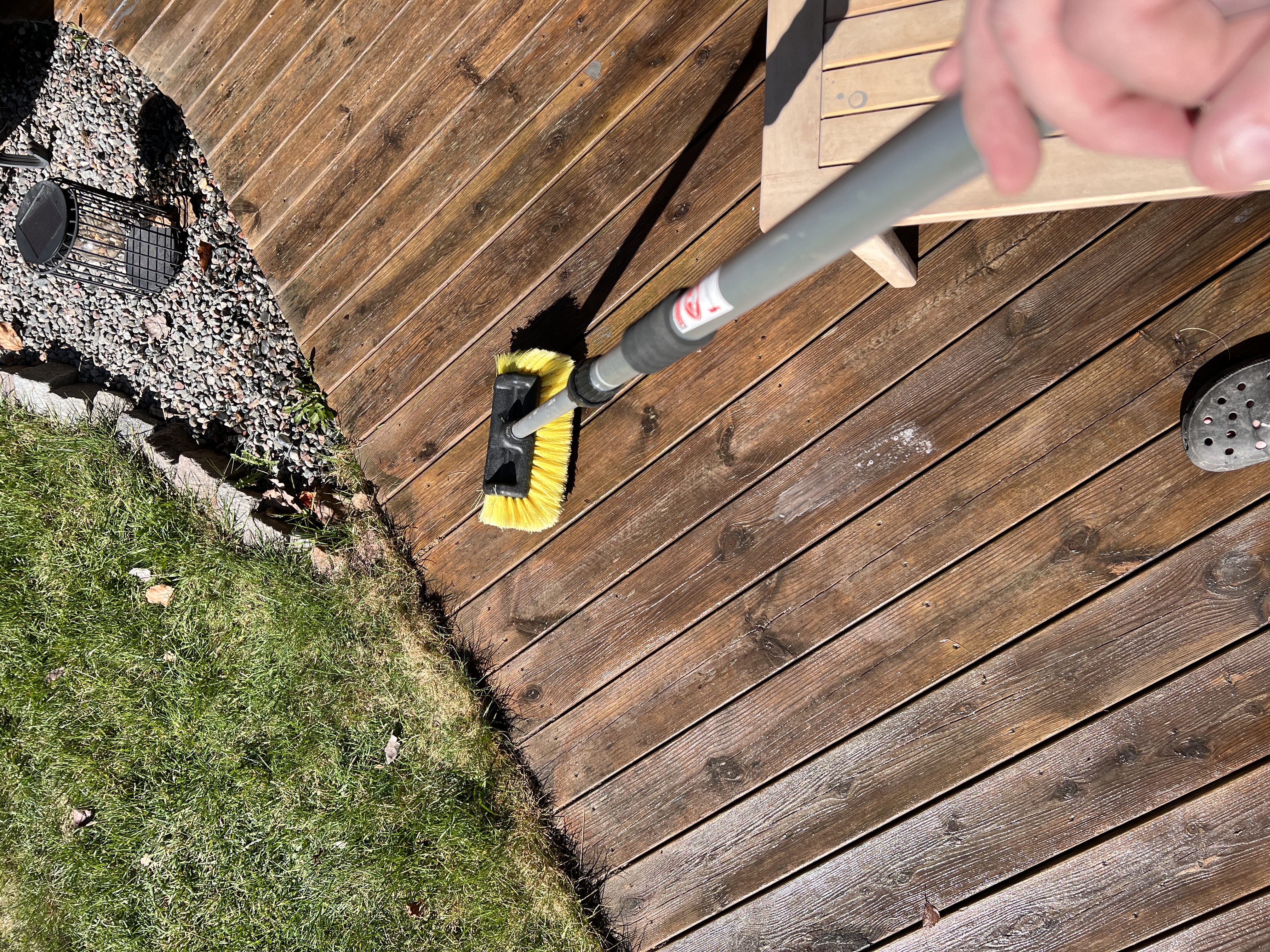 Något år lär jag behöva slipa trallen men i år fick det bli en grundlig rengöring. Det är en riktigt stor trall på säkert 300kvm så det är ett hästjobb. Hade införskaffat mig en PCL-4 men var inte så imponerad av den. Behandlade hela trallen med ättika, vatten och lite diskmedel, och sedan Kärchern. Men var inte nöjd som sagt, så gick efter en gång till med högtryckstvätten och tvättrondellen för just trallen - mycket bättre.