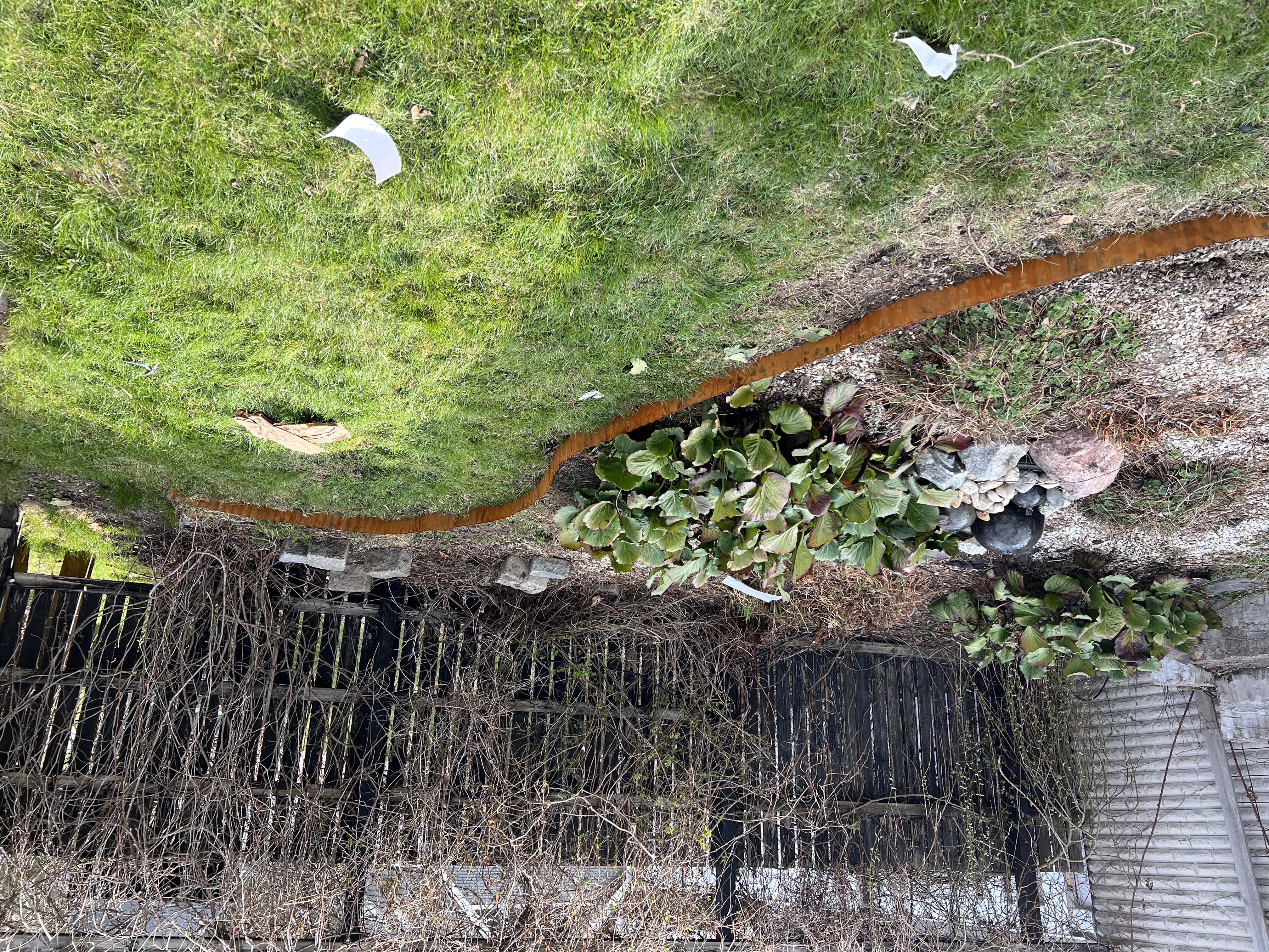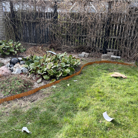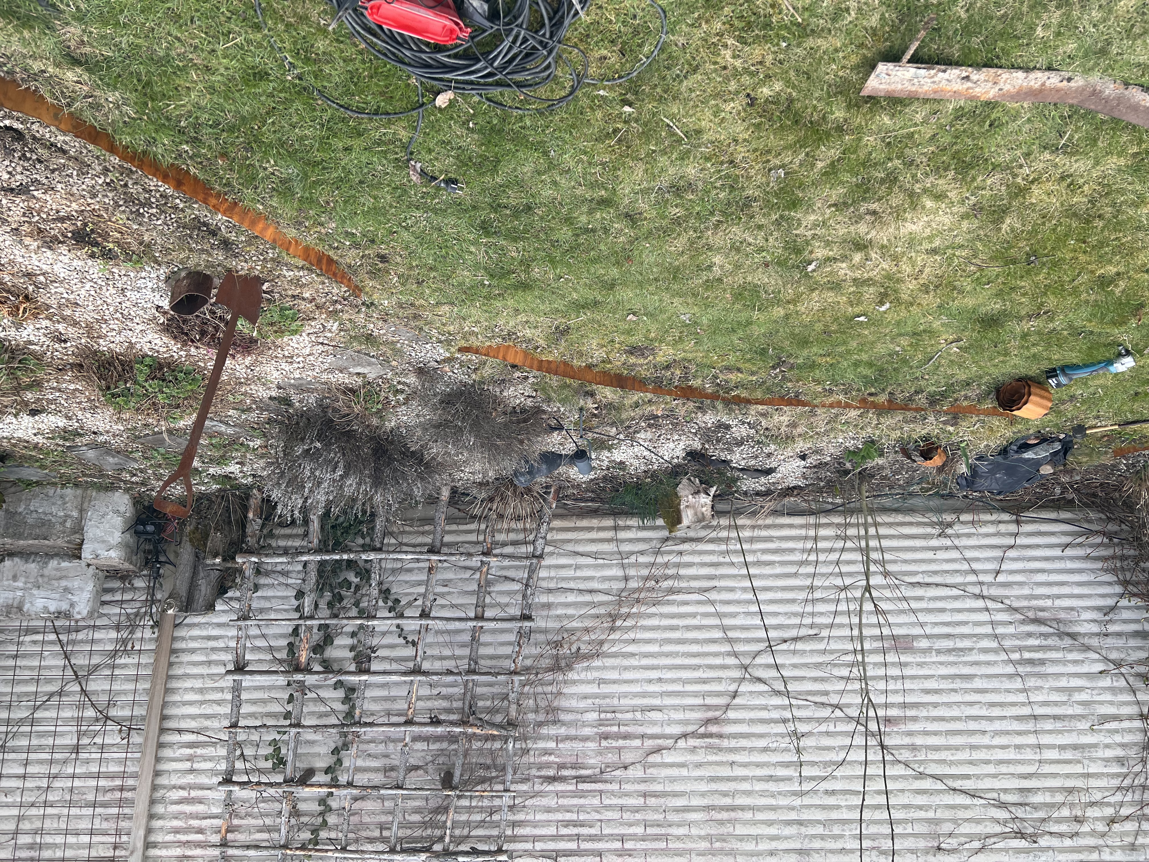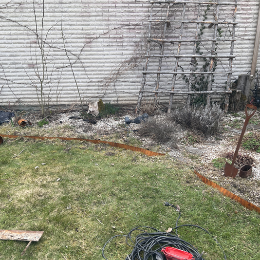 Köpte sådan korrugerad rostig rabattkant för länge sedan man inte fått arslet ur förrän nu. Det blev väldigt bra! Dock så råkade jag dra upp och ha av linan till robotgräsklipparen så klart. Passade på att dra om all el i rabatten så nu funkar den lilla fontänen igen!