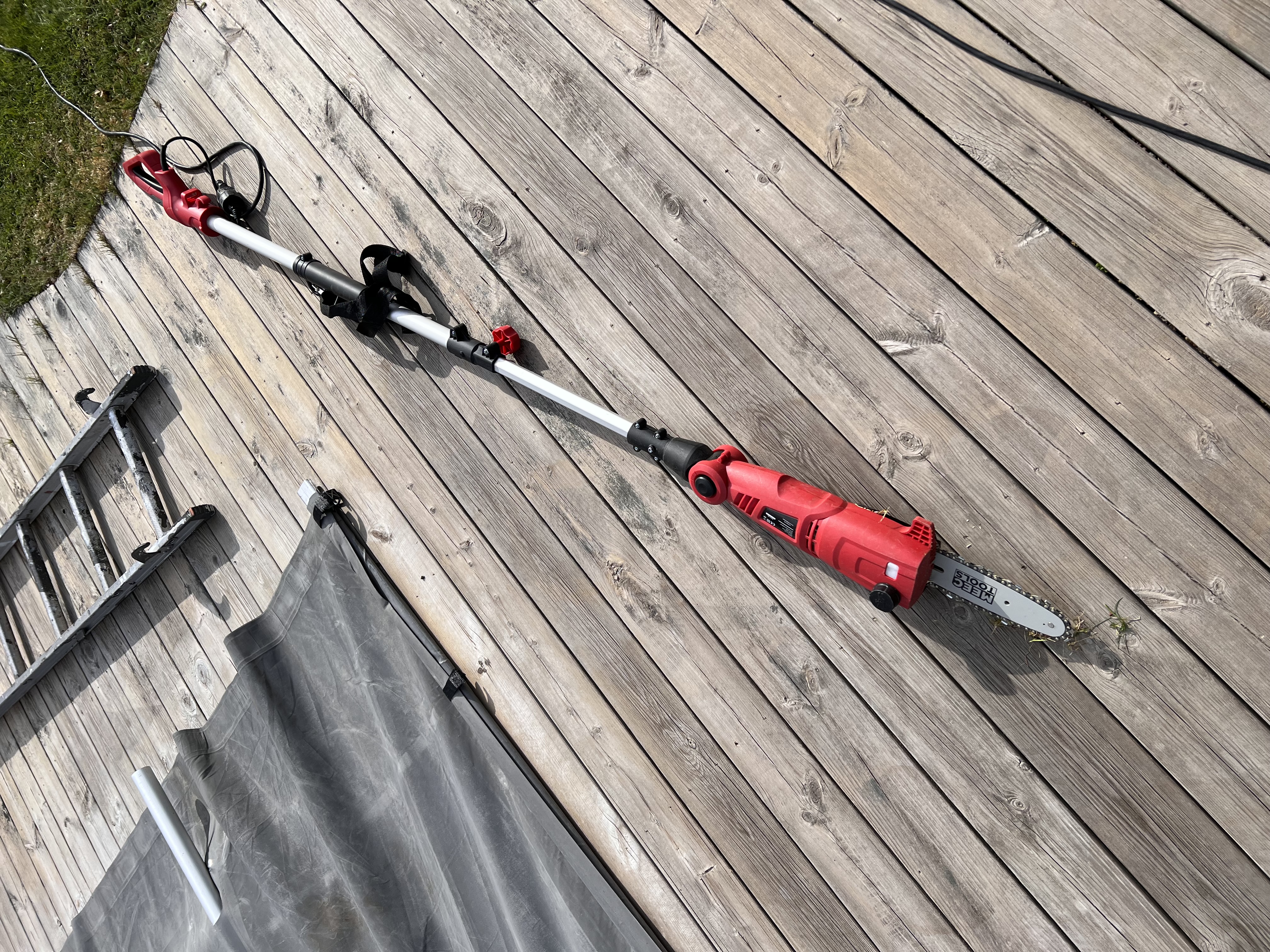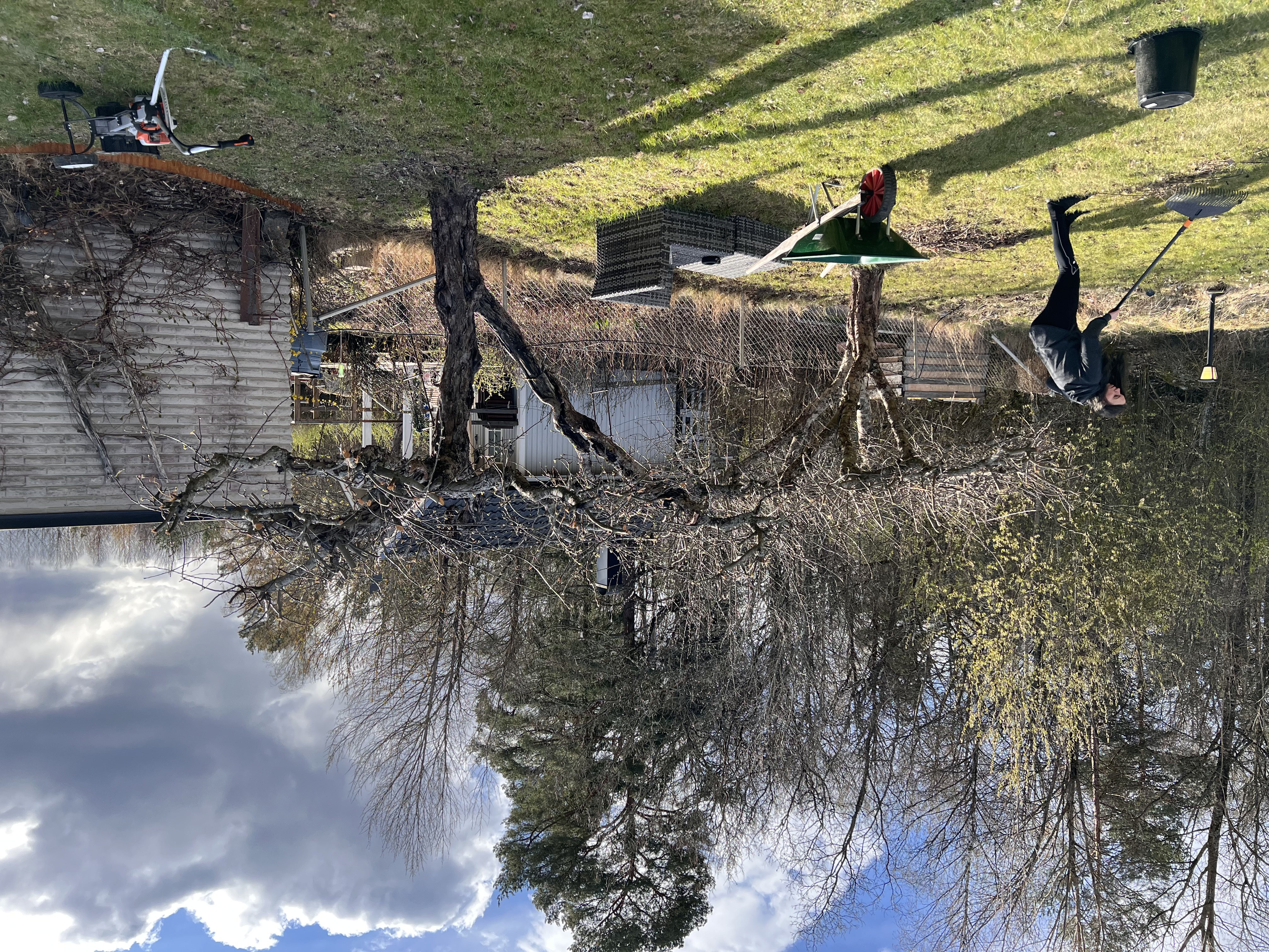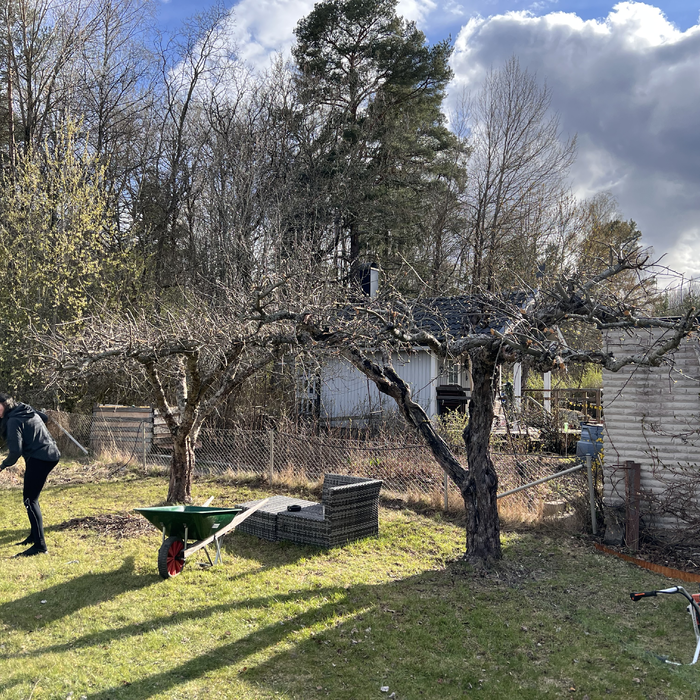 På baksidan finns två äppelträd, som producerar på tok för mycket fallfrukt. Så nu på vårkanten så beskar jag dem kraftigt med förhoppningen att det blir lite löv men inte så mycket äpplen, vi får se. Dessa ska bort den här eller nästa säsongen. Är inte så förtjust i äppelträd. Men jag köpte mig en rätt billig grensåg på Jula för att lite enklare ta hand om beskärningen och det gjorde en riktigt bra skillnad.