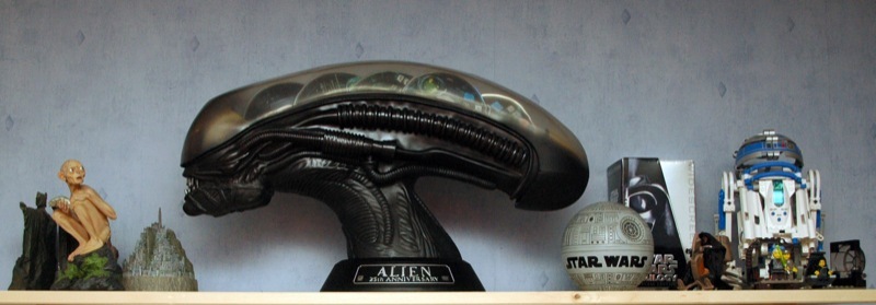 Övriga saker på hyllan är alla statyetter från Lord of the Rings-boxarna (Argonauth, Gollum och Minas Tirith), en Death Star som har ett Star Wars armbandsur och en rebel pin i sig. R2-D2 i Legos Mindstorms Droid Development Kit och lite annat Lego Star Wars och en Darth Maul leksak.