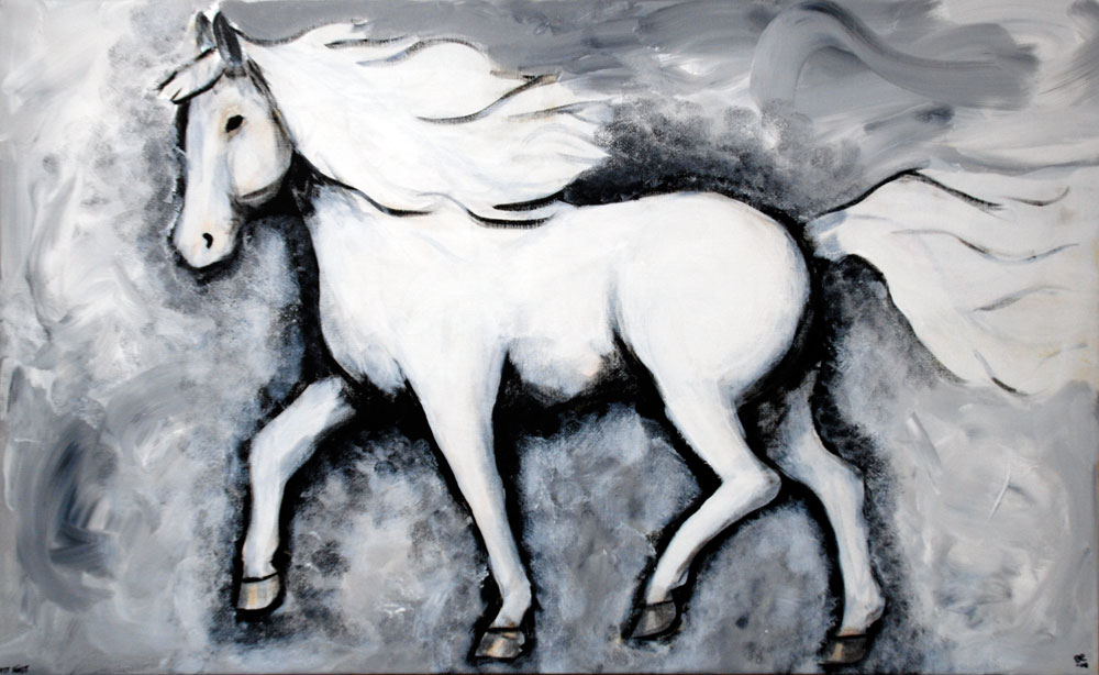 En vit häst på en jättestor duk, menad att sitta ovanför soffan i vardagsrummet.