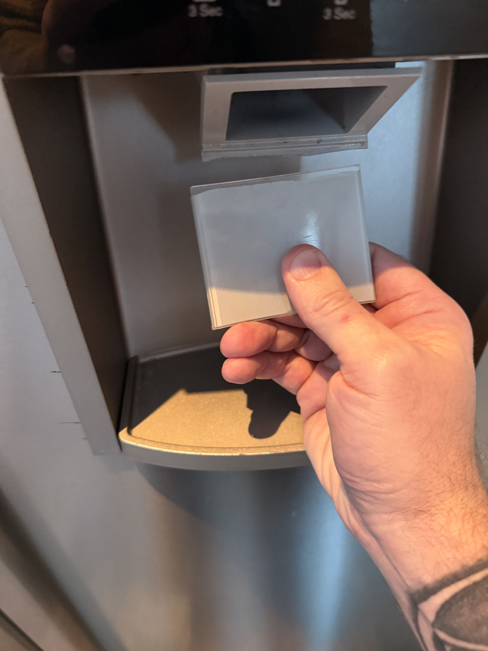 Vi hade fest i helgen och den där flärpen till ismaskinen som man trycker glaset mot för att få is gick sönder. Jag kollade upp vad en reservdel skulle kosta vilket inte var så farligt, men väldigt osäkert hur man skulle montera den för det kändes som att man behövde montera ned hela dörren till frysen.